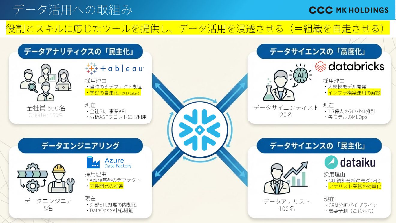 14 データ活用への取組み 役割とスキルに応じたツールを提供し、データ活用を浸透させる(=組織を自走させる) 採用理由 ・当時のBIデファクト製品 ・学びの自走化(DATA Saber) 現在 ・全社BI、事業KPI ・分析ASPフロントにも利用 全社員 600名 Creater 150名 データサイエンティスト 20名 採用理由 ・大規模モデル開発 ・インフラ構築運用の解放 現在 ・1.3億人のライフスタイル推計 ・各モデルのMLOps データアナリスト 100名 採用理由 ・GUI統計分析のモダン化 ・アナリスト業務の効率化 現在 ・CRM分析パイプライン ・需要予測(これから) データエンジニア 8名 採用理由 ・Azure基盤のデファクト ・内製開発の推進 現在 ・外部ETL処理の内製化 ・DataOpsの中心機能
