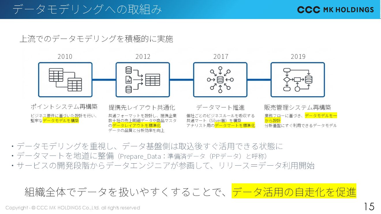 15 ・データモデリングを重視し、データ基盤側は取込後すぐ活用できる状態に ・データマートを地道に整備(Prepare_Data:準備済データ(PPデータ)と呼称) ・サービスの開発段階からデータエンジニアが参画して、リリース=データ利用開始 データモデリングへの取組み 上流でのデータモデリングを積極的に実施 2010 2012 2017 2019 提携先レイアウト共通化 データマート推進 ポイントシステム再構築 販売管理システム再構築 ビジネス要件に基づいた設計を行い、 堅牢なデータモデルを構築 共通フォーマットを設計し、提携企業 数十社の売上明細データや商品マスタ のデータレイアウトを標準化 データの品質と分析効率を向上 個社ごとのビジネスルールを吸収する 共通マート(Silver層)を構築 アナリスト用のデータマートを標準化 業務フローに基づき、データモデルを一 から設計 分析基盤にすぐ利用できるデータモデル 組織全体でデータを扱いやすくすることで、データ活用の自走化を促進