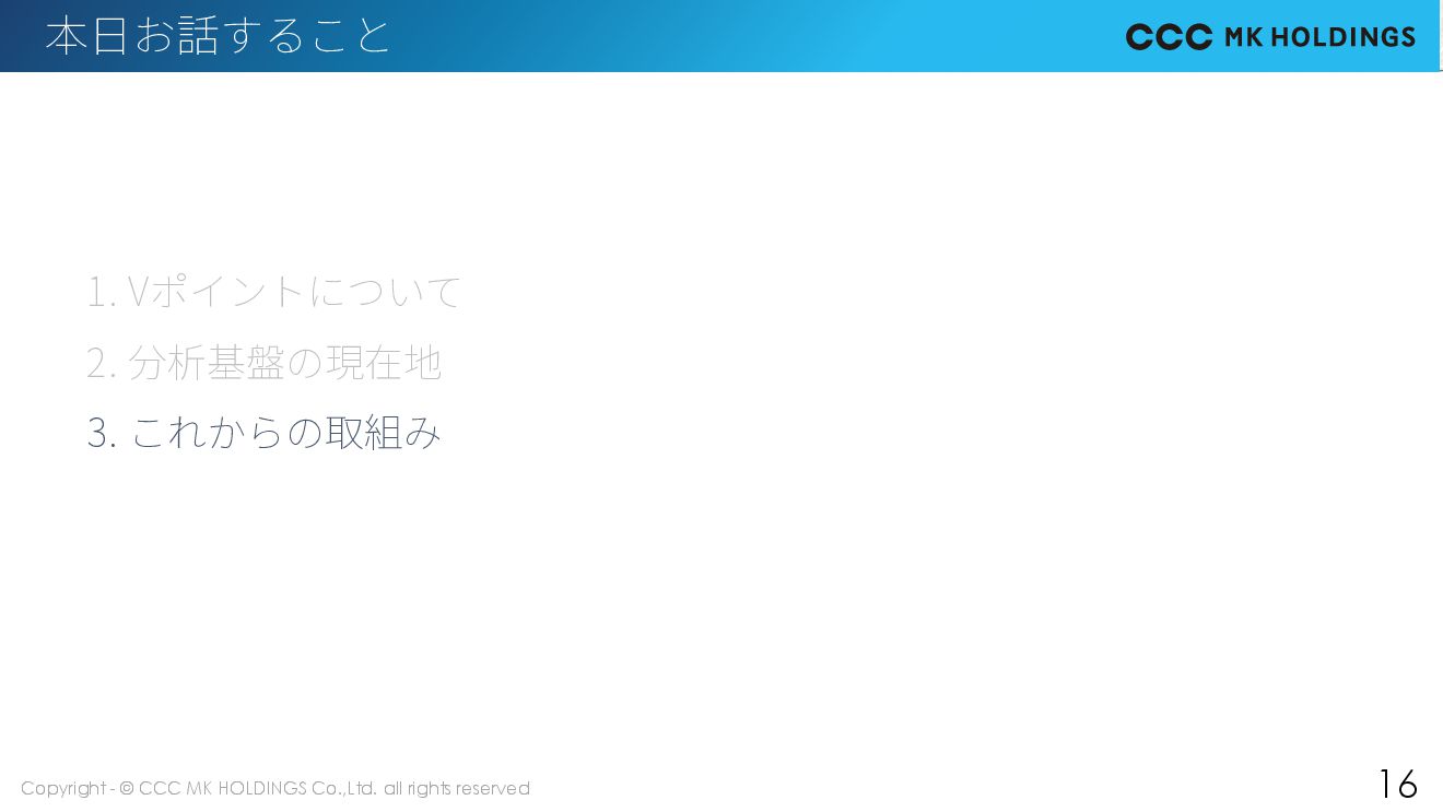 16 本日お話すること 1. Vポイントについて 2. 分析基盤の現在地 3. これからの取組み