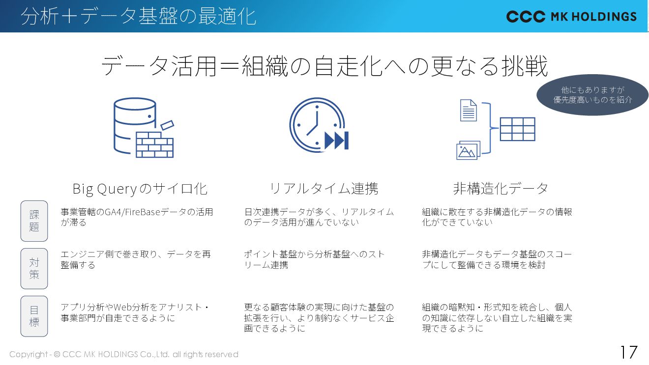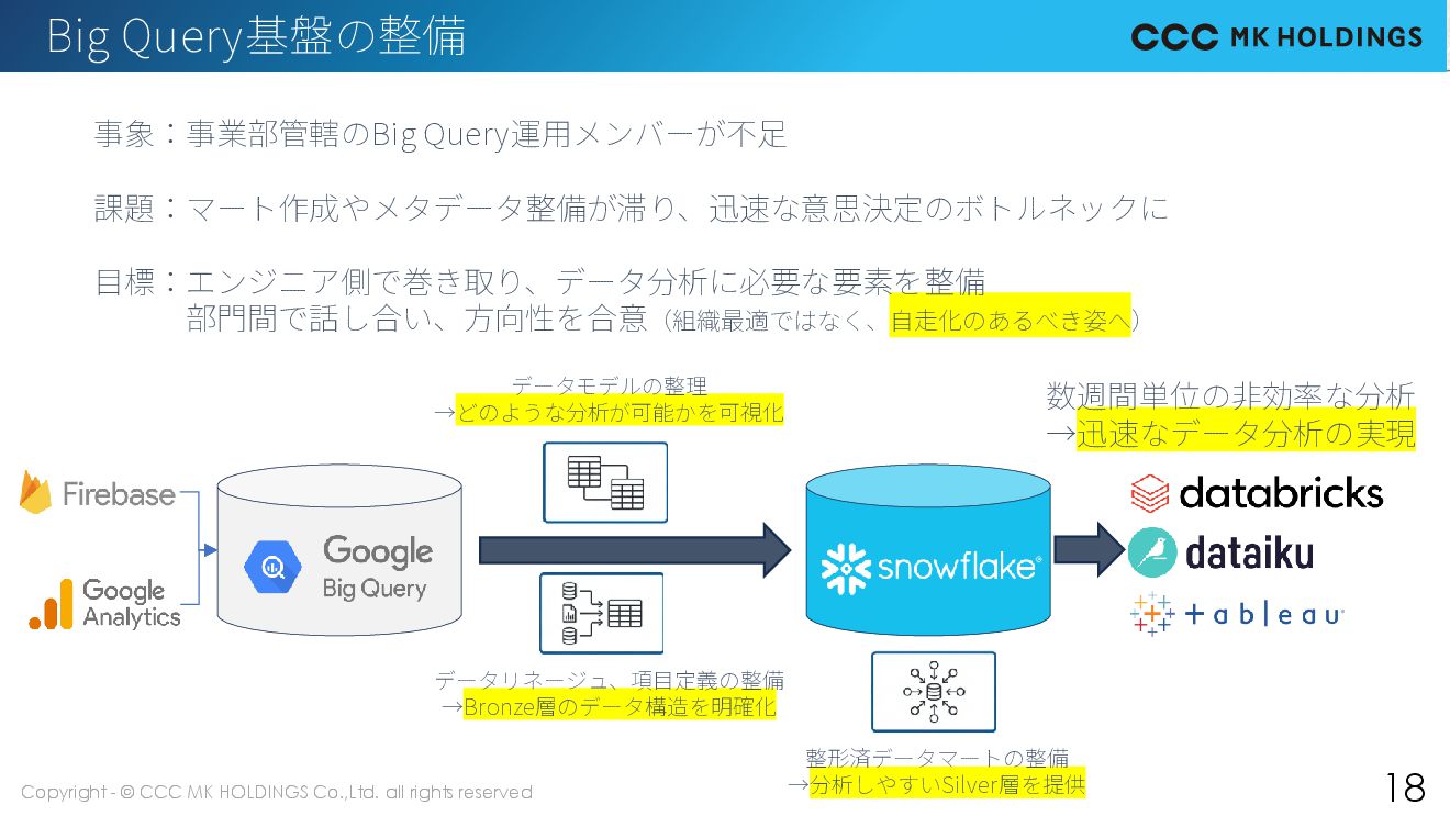 17 分析+データ基盤の最適化 他にもありますが 優先度高いものを紹介 データ活用=組織の自走化への更なる挑戦 Big Queryのサイロ化 リアルタイム連携 非構造化データ 事業管轄のGA4/FireBaseデータの活用 が滞る エンジニア側で巻き取り、データを再 整備する アプリ分析やWeb分析をアナリスト・ 事業部門が自走できるように 日次連携データが多く、リアルタイム のデータ活用が進んでいない ポイント基盤から分析基盤へのスト リーム連携 更なる顧客体験の実現に向けた基盤の 拡張を行い、より制約なくサービス企 画できるように 組織に散在する非構造化データの情報 化ができていない 非構造化データもデータ基盤のスコー プにして整備できる環境を検討 組織の暗黙知・形式知を統合し、個人 の知識に依存しない自立した組織を実 現できるように 課 題 対 策 目 標