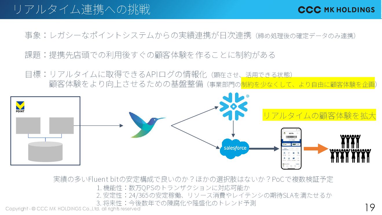 19 リアルタイム連携への挑戦 事象:レガシーなポイントシステムからの実績連携が日次連携(締め処理後の確定データのみ連携) 課題:提携先店頭での利用後すぐの顧客体験を作ることに制約がある 目標:リアルタイムに取得できるAPIログの情報化(顕在させ、活用できる状態) 顧客体験をより向上させるための基盤整備(事業部門の制約を少なくして、より自由に顧客体験を企画) 実績の多いFluent bitの安定構成で良いのか?ほかの選択肢はないか?PoCで複数検証予定 1. 機能性:数万QPSのトランザクションに対応可能か 2. 安定性:24/365の安定稼働、リソース消費やレイテンシの期待SLAを満たせるか 3. 将来性:今後数年での陳腐化や隆盛化のトレンド予測 リアルタイムの顧客体験を拡大