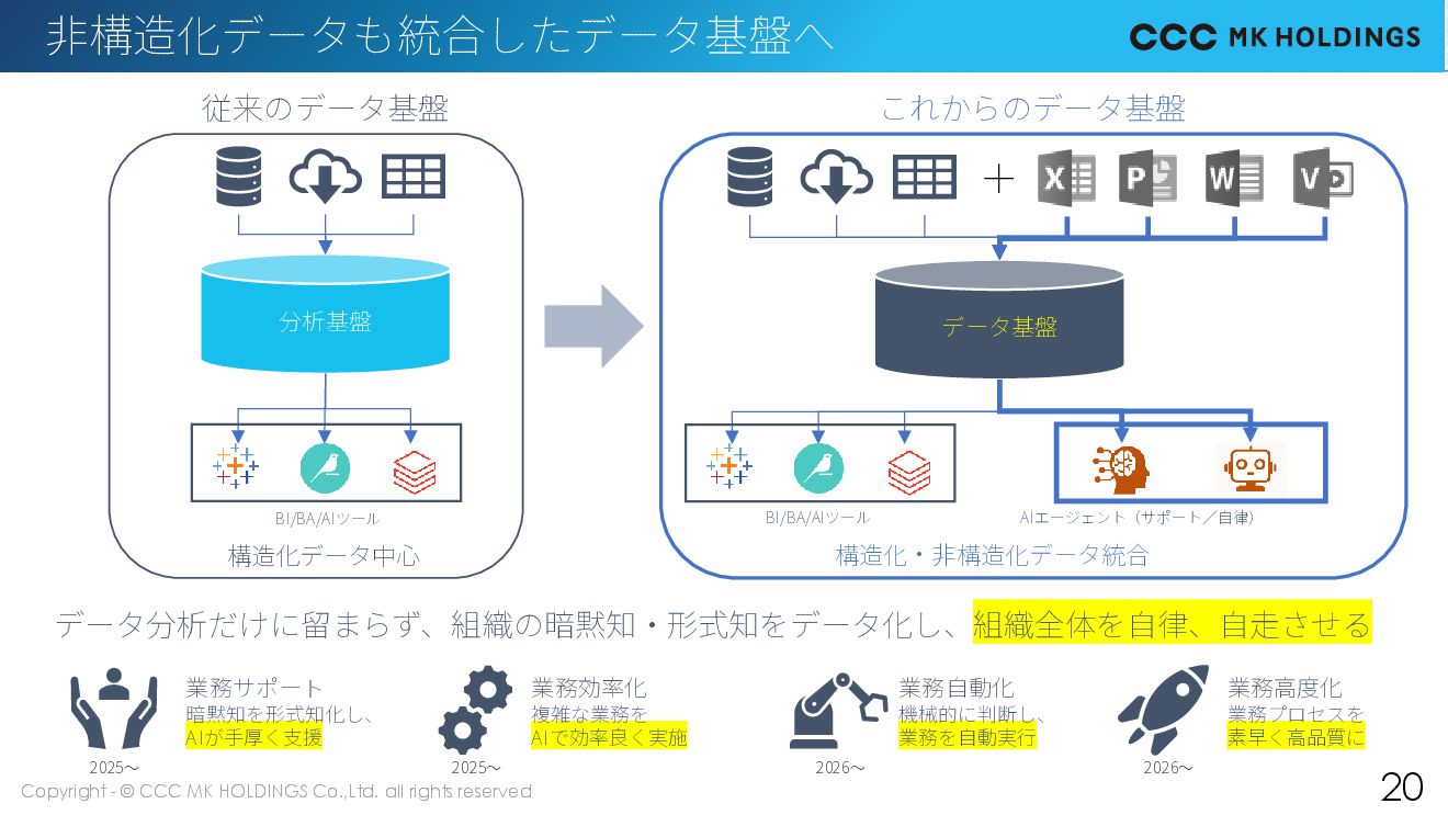 20 非構造化データも統合したデータ基盤へ 分析基盤 従来のデータ基盤 これからのデータ基盤 データ基盤 BI/BA/AIツール BI/BA/AIツール AIエージェント(サポート/自律) 構造化データ中心 構造化・非構造化データ統合 業務サポート 暗黙知を形式知化し、 AIが手厚く支援 業務効率化 複雑な業務を AIで効率良く実施 業務自動化 機械的に判断し、 業務を自動実行 業務高度化 業務プロセスを 素早く高品質に データ分析だけに留まらず、組織の暗黙知・形式知をデータ化し、組織全体を自律、自走させる 2025~ 2025~ 2026~ 2026~ +
