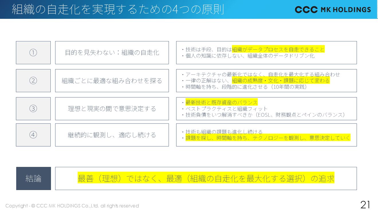 21 組織の自走化を実現するための4つの原則 ① 目的を見失わない:組織の自走化 ・技術は手段、目的は組織がデータプロセスを自走できること ・個人の知識に依存しない、組織全体のデータドリブン化 ② 組織ごとに最適な組み合わせを探る ・アーキテクチャの最新化ではなく、自走化を最大化する組み合わせ ・一律の正解はない、組織の成熟度・文化・課題に応じて変わる ・時間軸を持ち、段階的に進化させる(10年間の実践) ③ 理想と現実の間で意思決定する ・最新技術と既存資産のバランス ・ベストプラクティスと組織フィット ・技術負債をいつ解消すべきか(EOSL、財務観点とペインのバランス) 結論 最善(理想)ではなく、最適(組織の自走化を最大化する選択)の追求 ④ 継続的に観測し、適応し続ける ・技術も組織の課題も進化し続ける ・課題を探し、時間軸を持ち、テクノロジーを観測し、意思決定していく