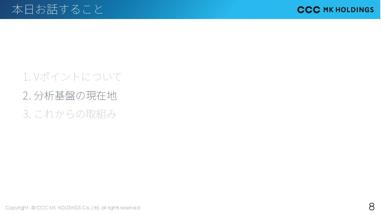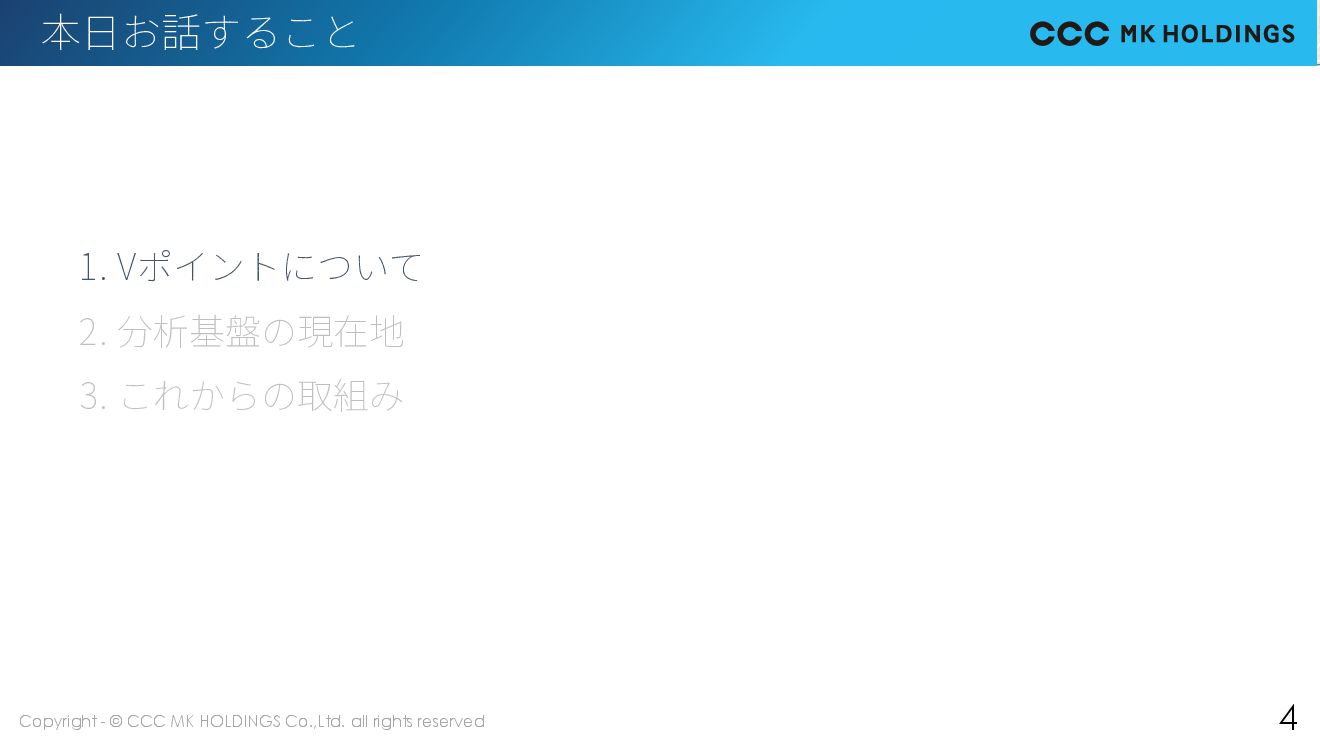 3 本日お話すること 1. Vポイントについて 2. 分析基盤の現在地 3. これからの取組み