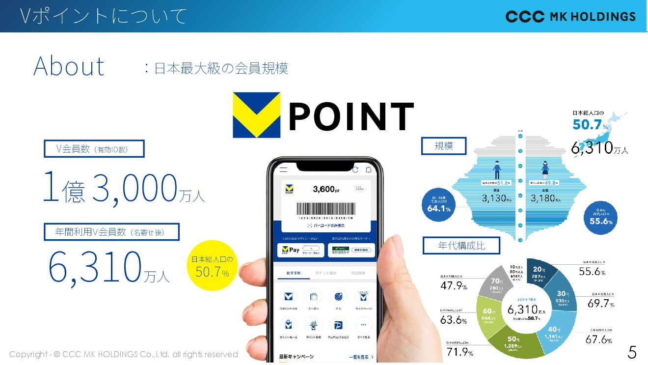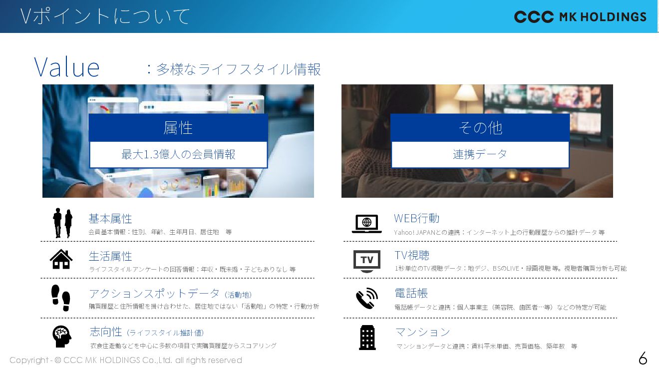 5 About Vポイントについて 5 :日本最大級の会員規模 年代構成比 年間利用V会員数(名寄せ後) V会員数(有効ID数) 1億 3,000 万人 6,310 万人 規模 日本総人口の 50.7%