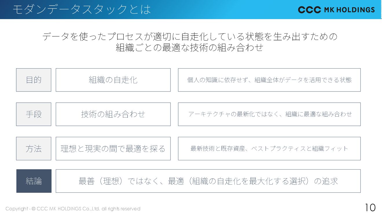 10 モダンデータスタックとは 目的 組織の自走化 個人の知識に依存せず、組織全体がデータを活用できる状態 手段 技術の組み合わせ アーキテクチャの最新化ではなく、組織に最適な組み合わせ 方法 理想と現実の間で最適を探る 最新技術と既存資産、ベストプラクティスと組織フィット 結論 最善(理想)ではなく、最適(組織の自走化を最大化する選択)の追求 データを使ったプロセスが適切に自走化している状態を生み出すための 組織ごとの最適な技術の組み合わせ