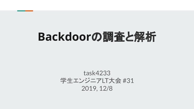 2018)  - 開発者が私的な利益のために組み込むBackdoor   e.g.) ネット通販にバックドア仕込む、開発エンジニアが逮捕・起訴(読売新聞, 2004)  - 意図されない開発段階のBackdoor   e.g.) ルータに搭載された遠隔管理機能(Trend Micro, 2017)  - 稼働中のコンピュータに外部から送り込まれる    Backdoor