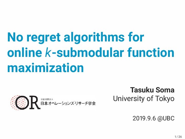 [Buchbinder et al. ] -regret O(n √ T) [Roughgarden and Wang 8] k = -approx [Ward and Živný 6] -regret O(n √ T) general k -approx [Iwata, Tanigawa, and Yoshida 6] -regret O(nk √ T) / 6
