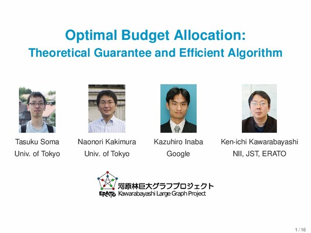 → R ... monotone submodular function over integer lattice • x ≤ y =⇒ f(x) ≤ f(y) • f(x) + f(y) ≥ f(x ∨ y) + f(x ∧ y) (∀x, y ∈ ZS) (x ∨ y : elem-wise max, x ∧ y : elem-wise min) cf. submodularity for set functions: f(X) + f(Y) ≥ f(X ∪ Y) + f(X ∩ Y) (∀X, Y ⊆ S) c ∈ ZS + , w ∈ ZS + , B ∈ Z≥0 Maximize f(b) subject to 0 ≤ b ≤ c s∈S w(s)b(s) ≤ B (knapsack constraint) b ∈ ZS 7 / 16