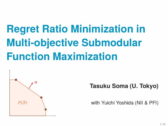 Bound Given an α-approx algorithm for (weighted) single objective problem, • regret ratio 1 − α/d for any d • regret ratio 1 − α + O(1/k) for any k and d = 2. d = # objectives, k = # of feasible solutions Lower Bound • Even if α = 1 and d = 2, it is impossible to achieve regret ratio o(1/k2). 15 / 15
