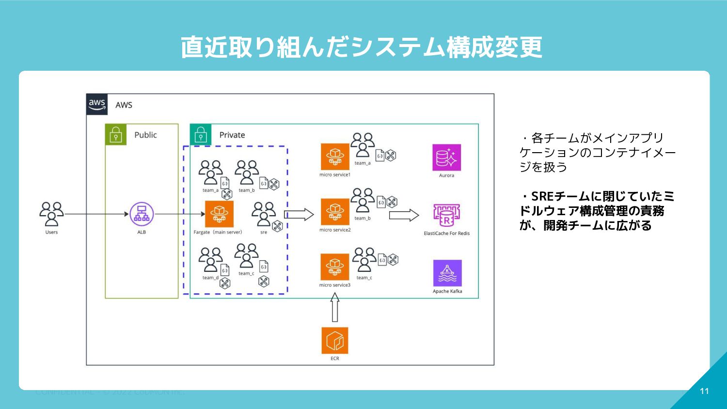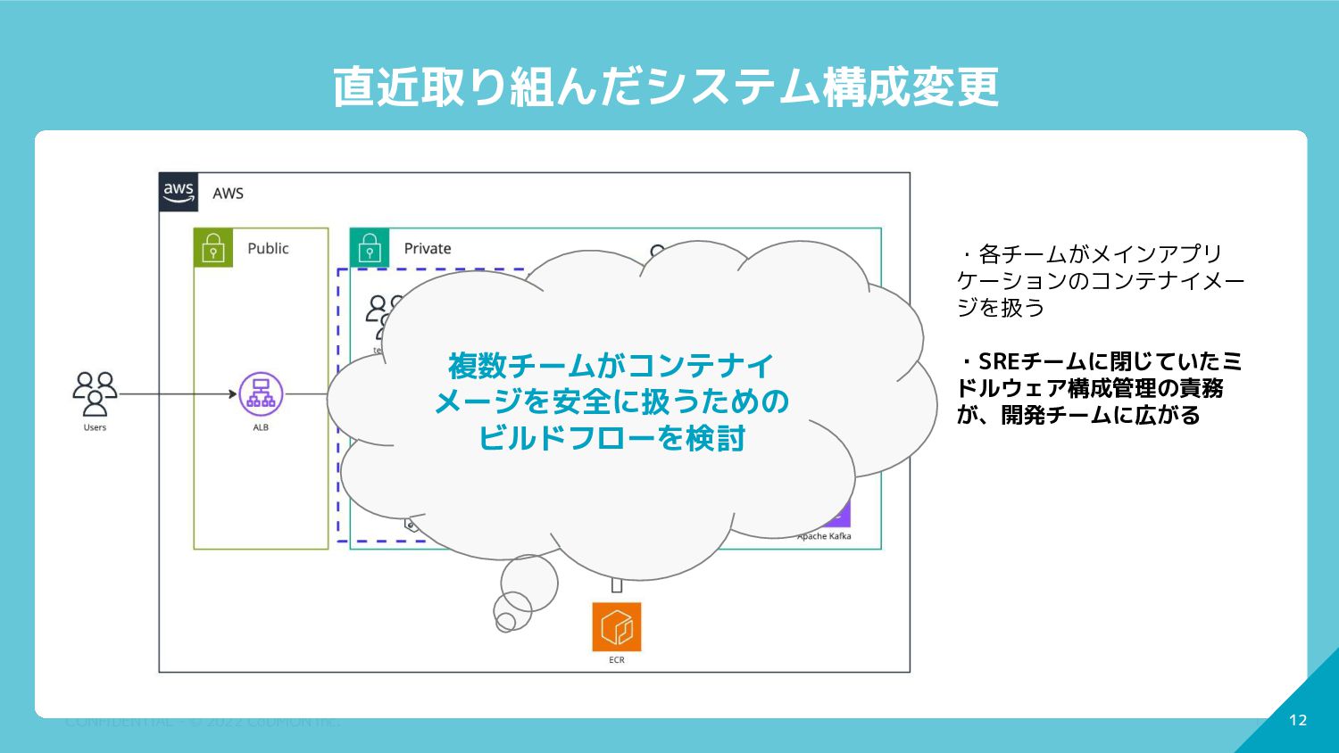 11 CONFIDENTIAL - © 2022 CoDMON Inc. 11 直近取り組んだシステム構成変更 ・各チームがメインアプリ