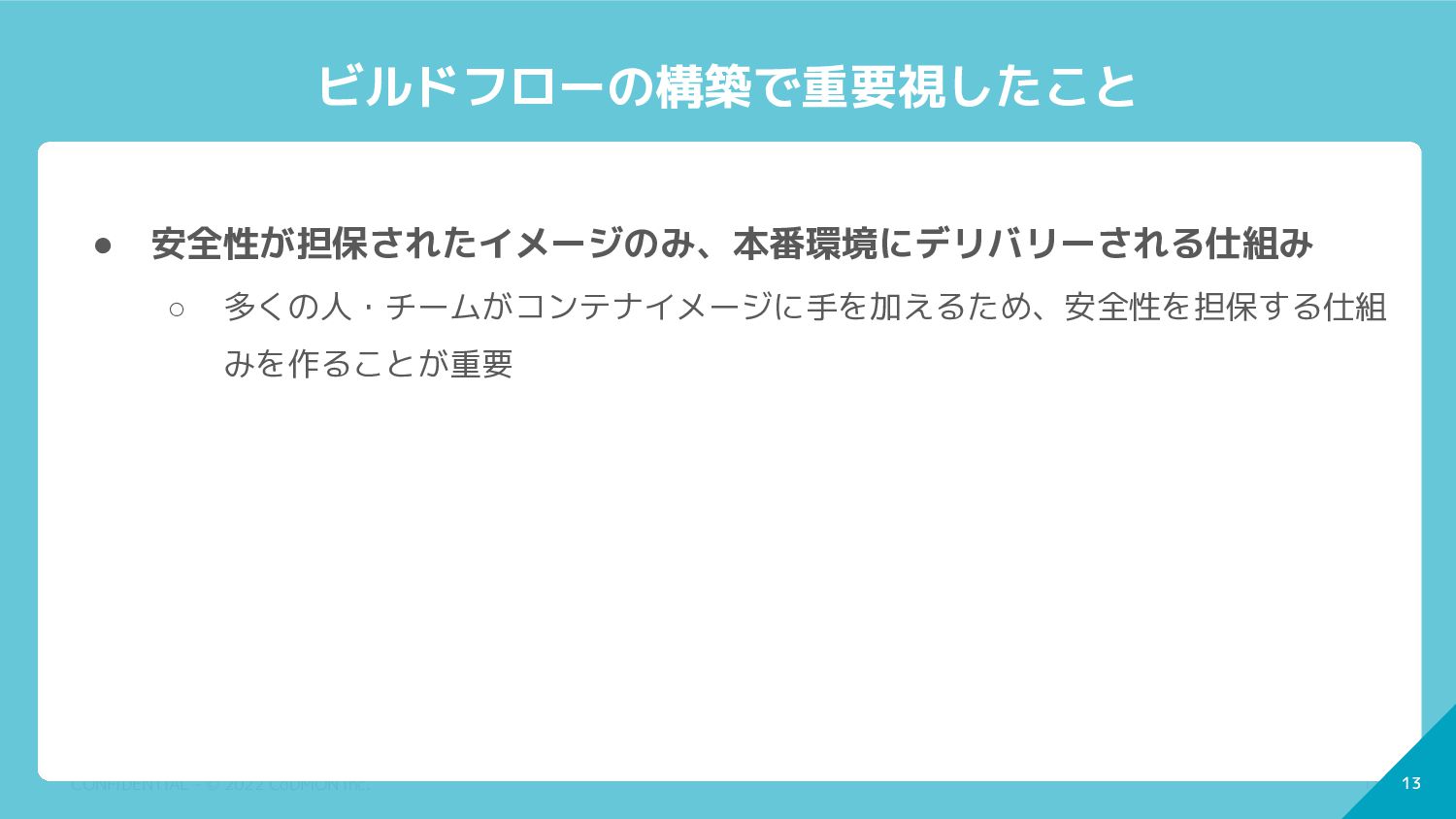 13 CONFIDENTIAL - © 2022 CoDMON Inc. 13 ビルドフローの構築で重要視したこと •