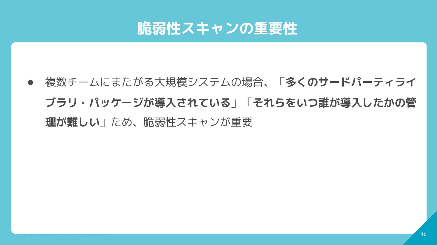 複数チームにまたがる大規模システムの場合、「多くのサードパーティライ ブラリ・パッケージが導入されている」「それらをいつ誰が導入したかの管 理が難しい」ため、脆弱性スキャンが重要
