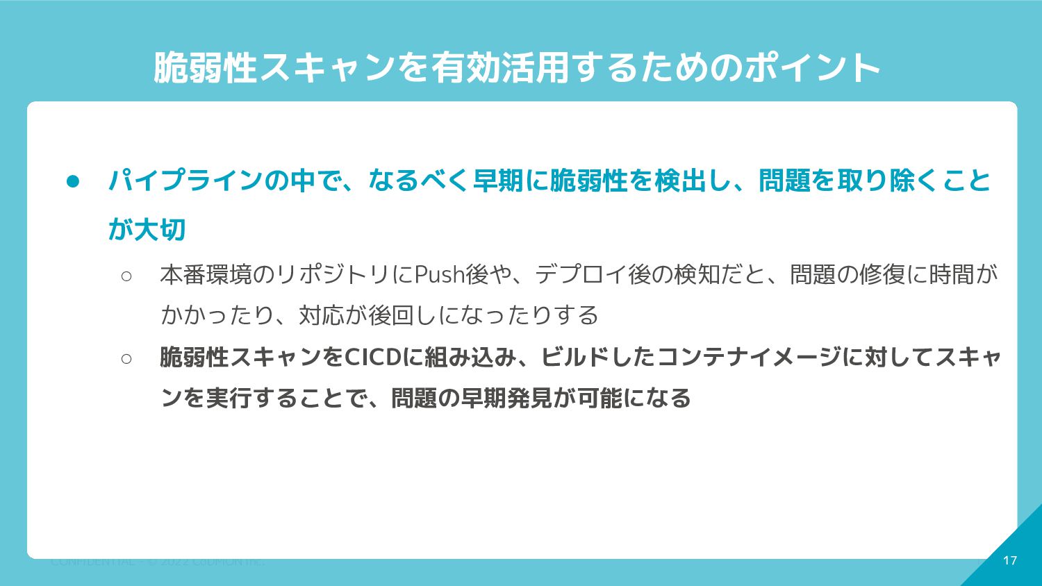 17 CONFIDENTIAL - © 2022 CoDMON Inc. 17 脆弱性スキャンを有効活用するためのポイント •