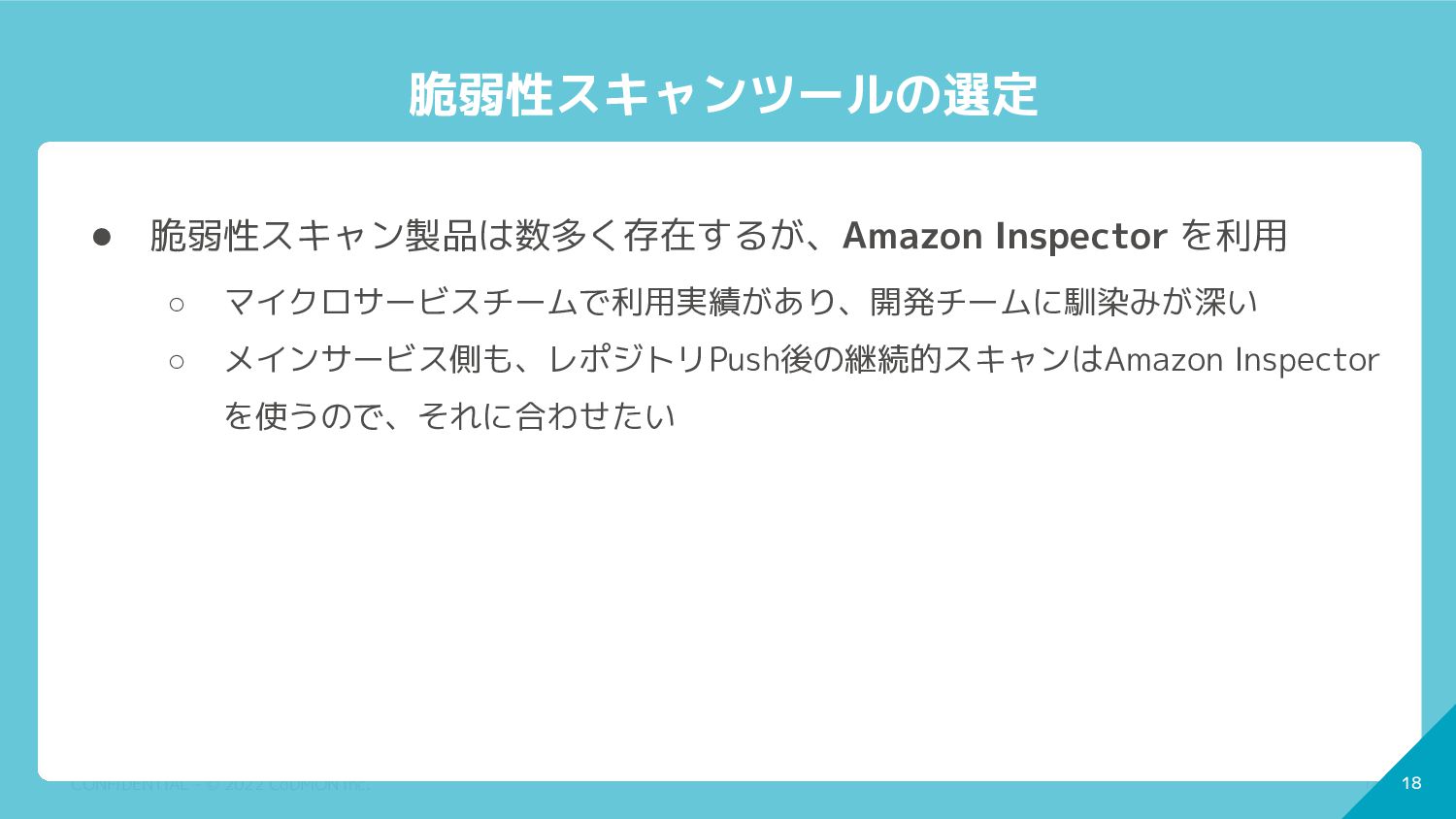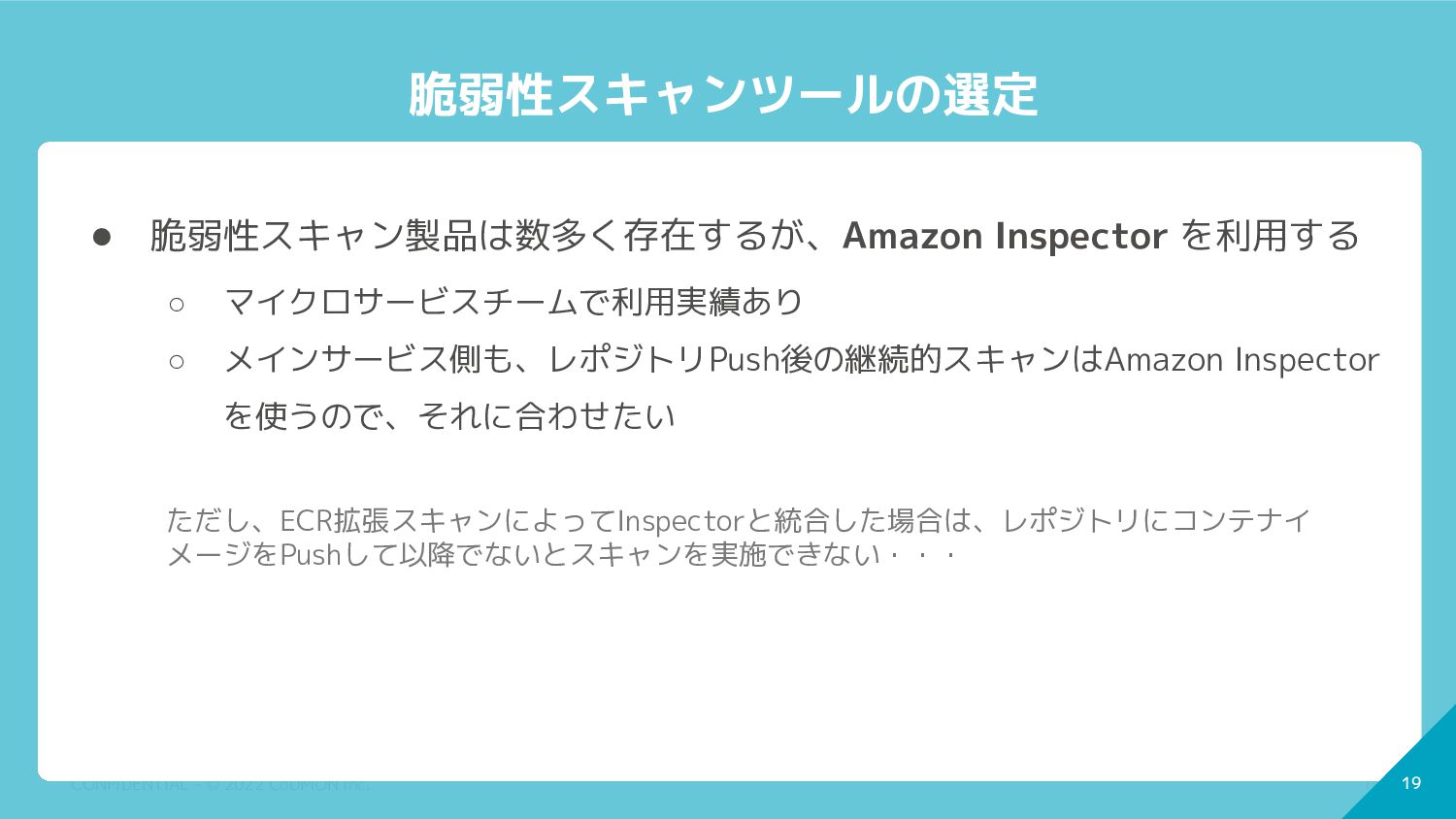 脆弱性スキャン製品は数多く存在するが、Amazon Inspector を利用 ◦ マイクロサービスチームで利用実績があり、開発チームに馴染みが深い ◦ メインサービス側も、レポジトリPush後の継続的スキャンはAmazon Inspector を使うので、それに合わせたい