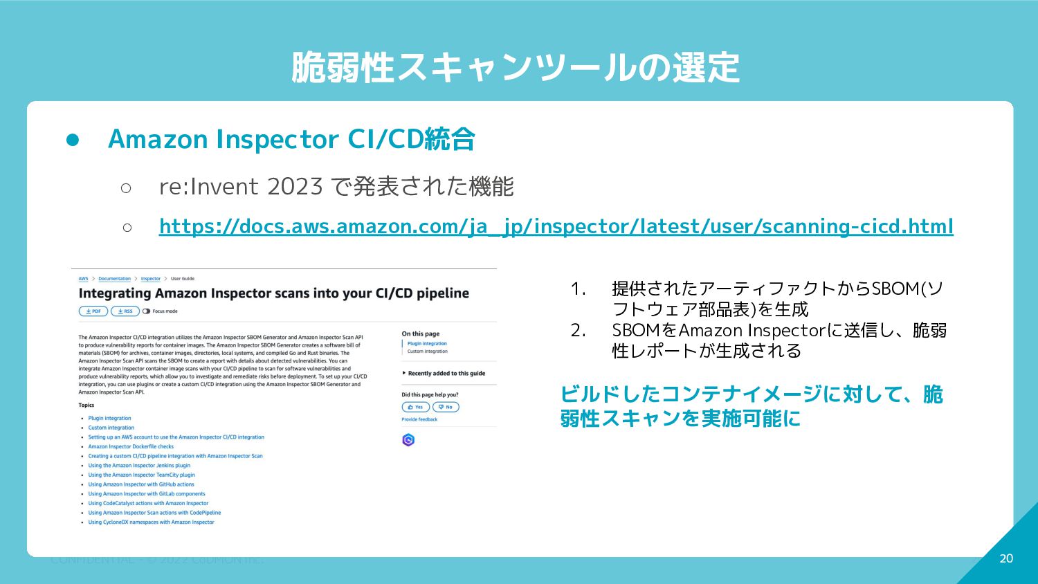 19 CONFIDENTIAL - © 2022 CoDMON Inc. 19 脆弱性スキャンツールの選定 •