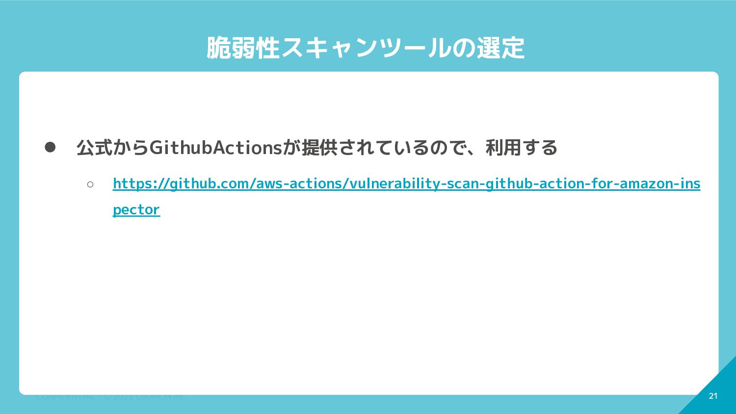 20 CONFIDENTIAL - © 2022 CoDMON Inc. 20 脆弱性スキャンツールの選定 •