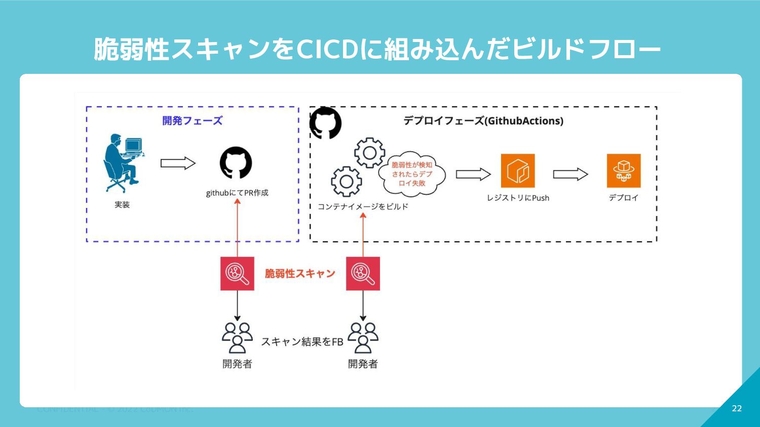 22 CONFIDENTIAL - © 2022 CoDMON Inc. 22 脆弱性スキャンをCICDに組み込んだビルドフロー