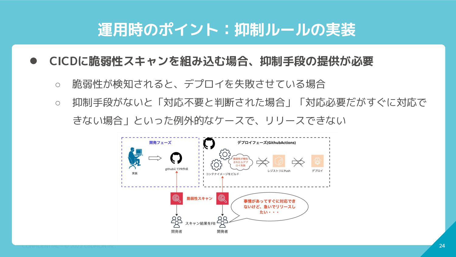 CICDに脆弱性スキャンを組み込む場合、抑制手段の提供が必要 ◦ 脆弱性が検知されると、デプロイを失敗させている場合 ◦ 抑制手段がないと「対応不要と判断された場合」「対応必要だがすぐに対応で きない場合」といった例外的なケースで、リリースできない