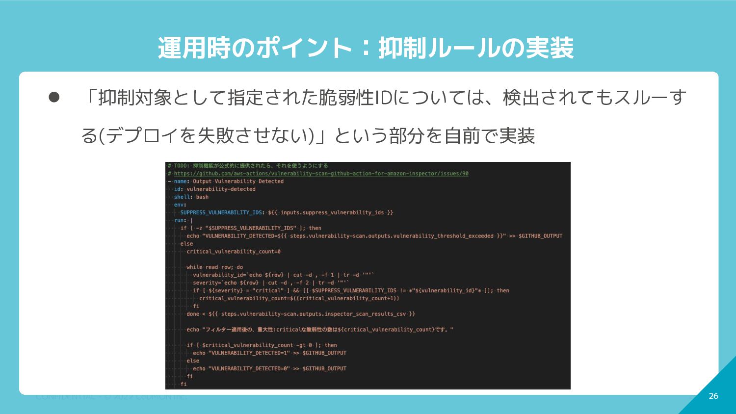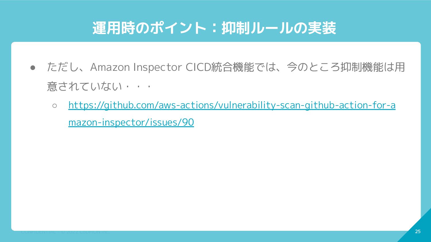 ただし、Amazon Inspector CICD統合機能では、今のところ抑制機能は用 意されていない・・・ ◦ https://github.com/aws-actions/vulnerability-scan-github-action-for-a mazon-inspector/issues/90