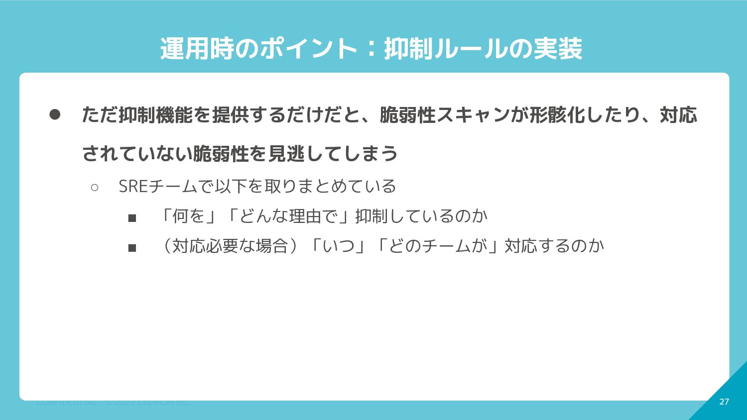 26 CONFIDENTIAL - © 2022 CoDMON Inc. 26 運用時のポイント:抑制ルールの実装 •