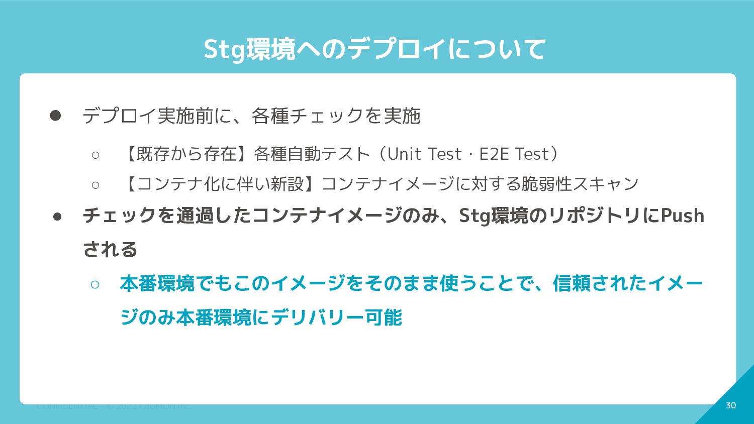 30 CONFIDENTIAL - © 2022 CoDMON Inc. 30 Stg環境へのデプロイについて •