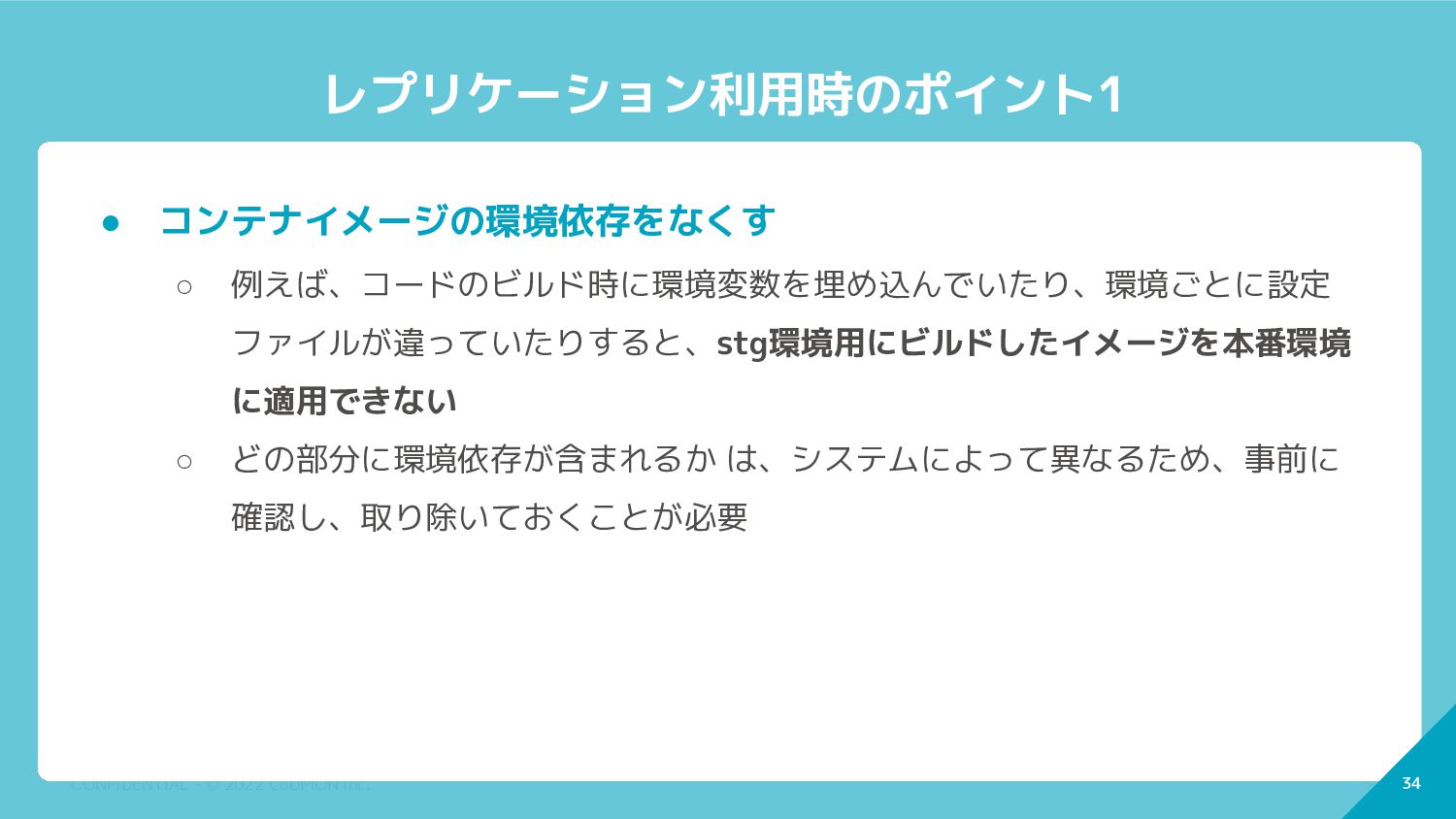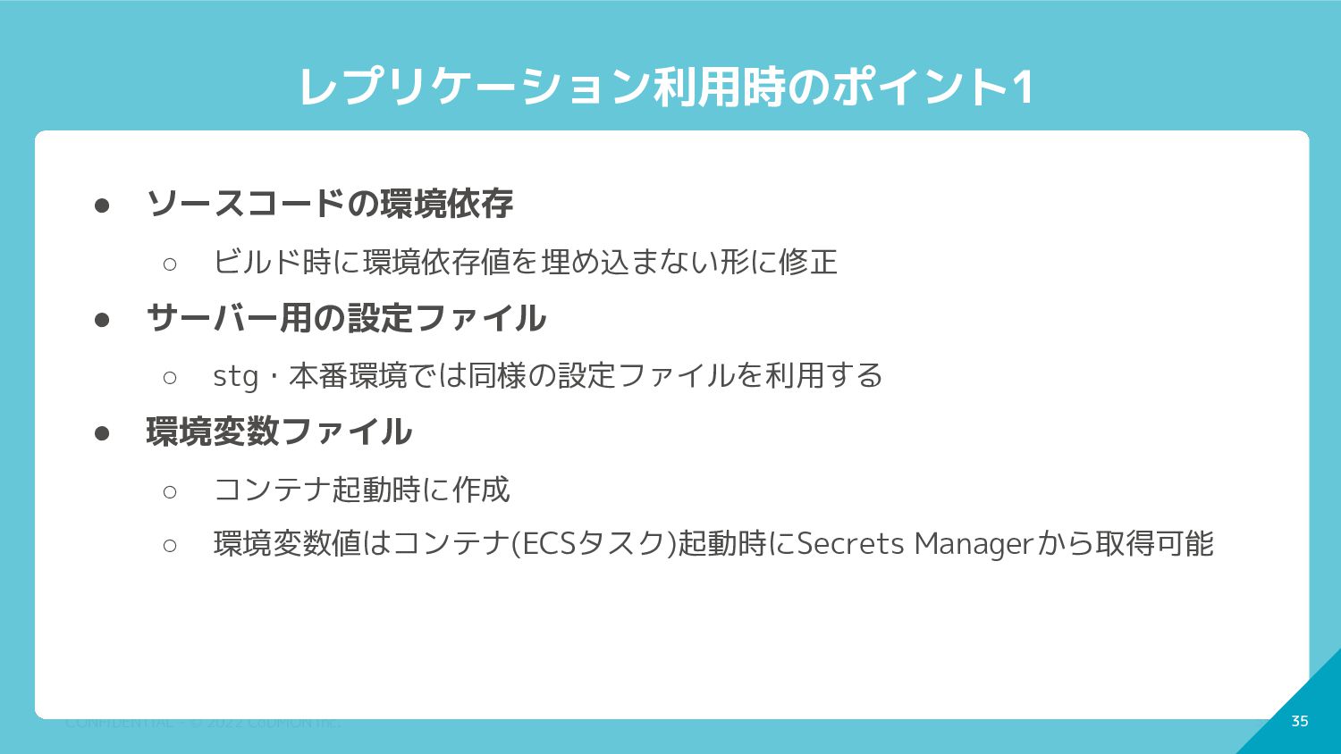 34 CONFIDENTIAL - © 2022 CoDMON Inc. 34 レプリケーション利用時のポイント1 •