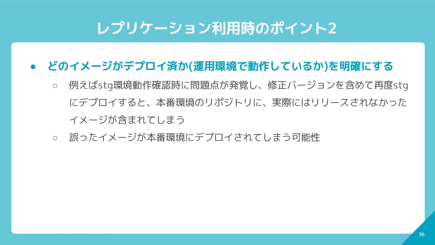 35 CONFIDENTIAL - © 2022 CoDMON Inc. 35 レプリケーション利用時のポイント1 •