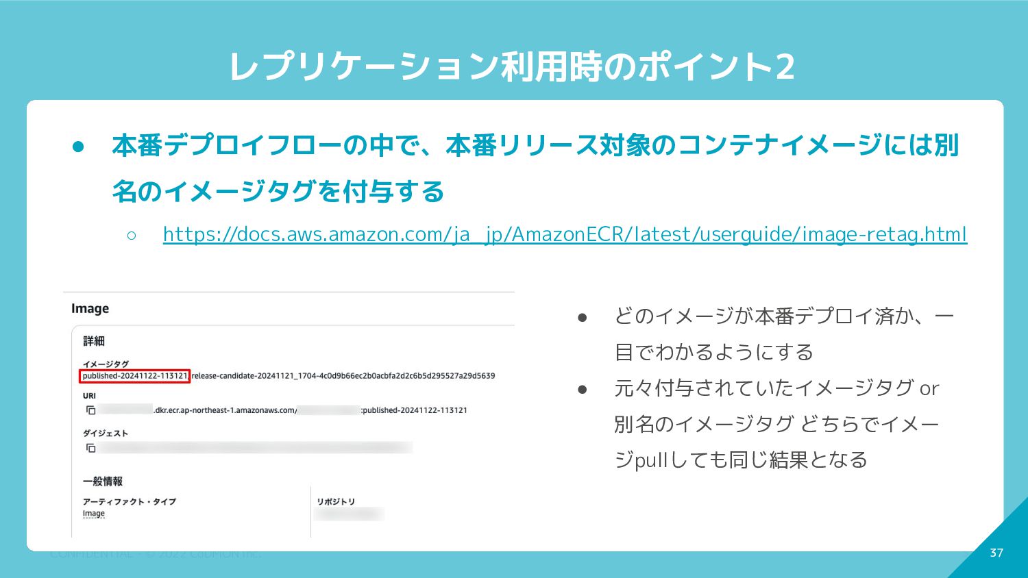 本番デプロイフローの中で、本番リリース対象のコンテナイメージには別 名のイメージタグを付与する ◦ https://docs.aws.amazon.com/ja_jp/AmazonECR/latest/userguide/image-retag.html • どのイメージが本番デプロイ済か、一 目でわかるようにする • 元々付与されていたイメージタグ or 別名のイメージタグ どちらでイメー ジpullしても同じ結果となる
