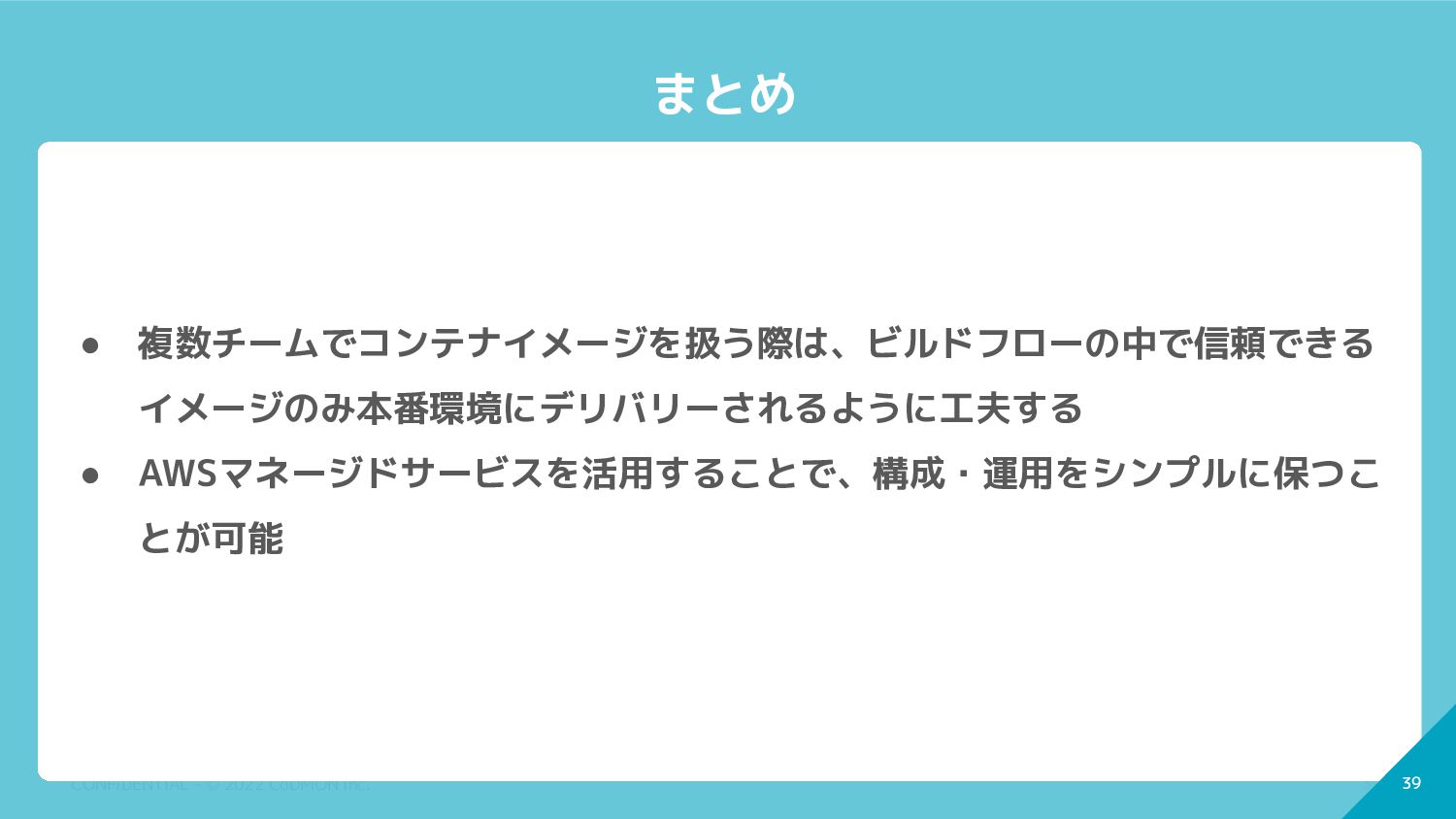 複数チームでコンテナイメージを扱う際は、ビルドフローの中で信頼できる イメージのみ本番環境にデリバリーされるように工夫する • AWSマネージドサービスを活用することで、構成・運用をシンプルに保つこ とが可能