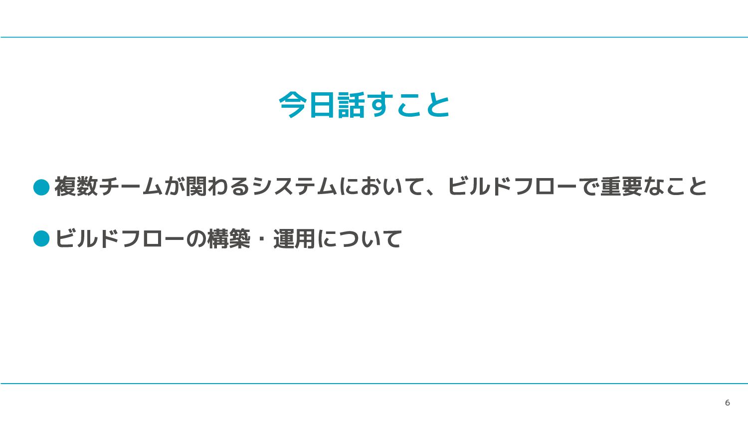 6 今日話すこと 複数チームが関わるシステムにおいて、ビルドフローで重要なこと ビルドフローの構築・運用について