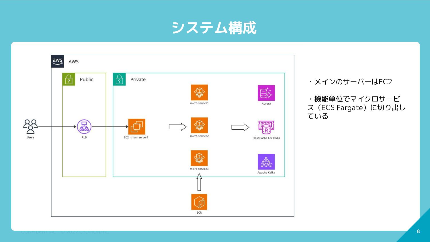 8 CONFIDENTIAL - © 2022 CoDMON Inc. 8 システム構成 ・メインのサーバーはEC2