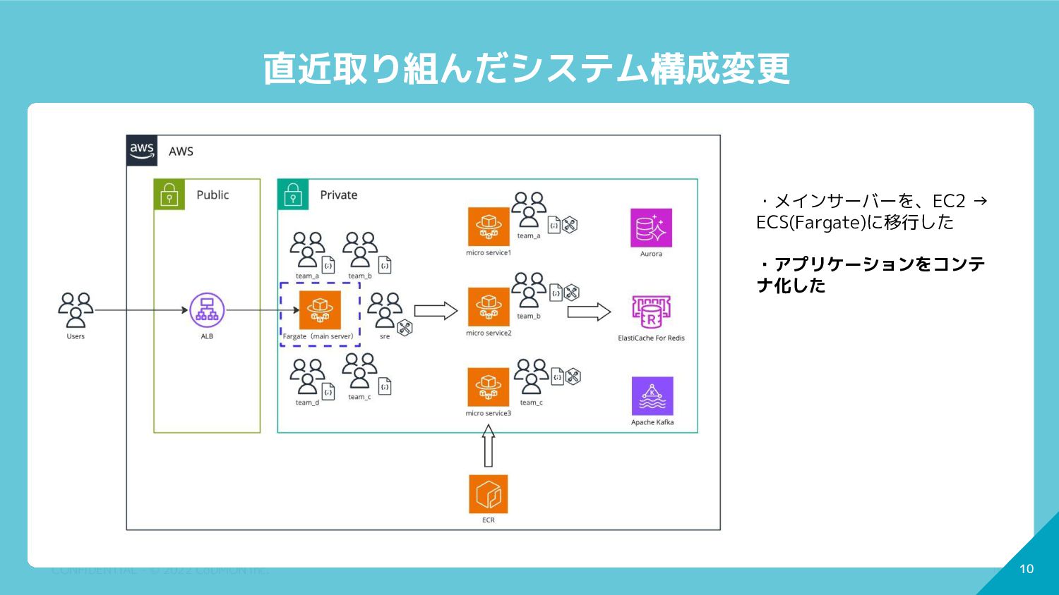 9 CONFIDENTIAL - © 2022 CoDMON Inc. 9 システム構成と組織 ・マイクロサービス(ECS