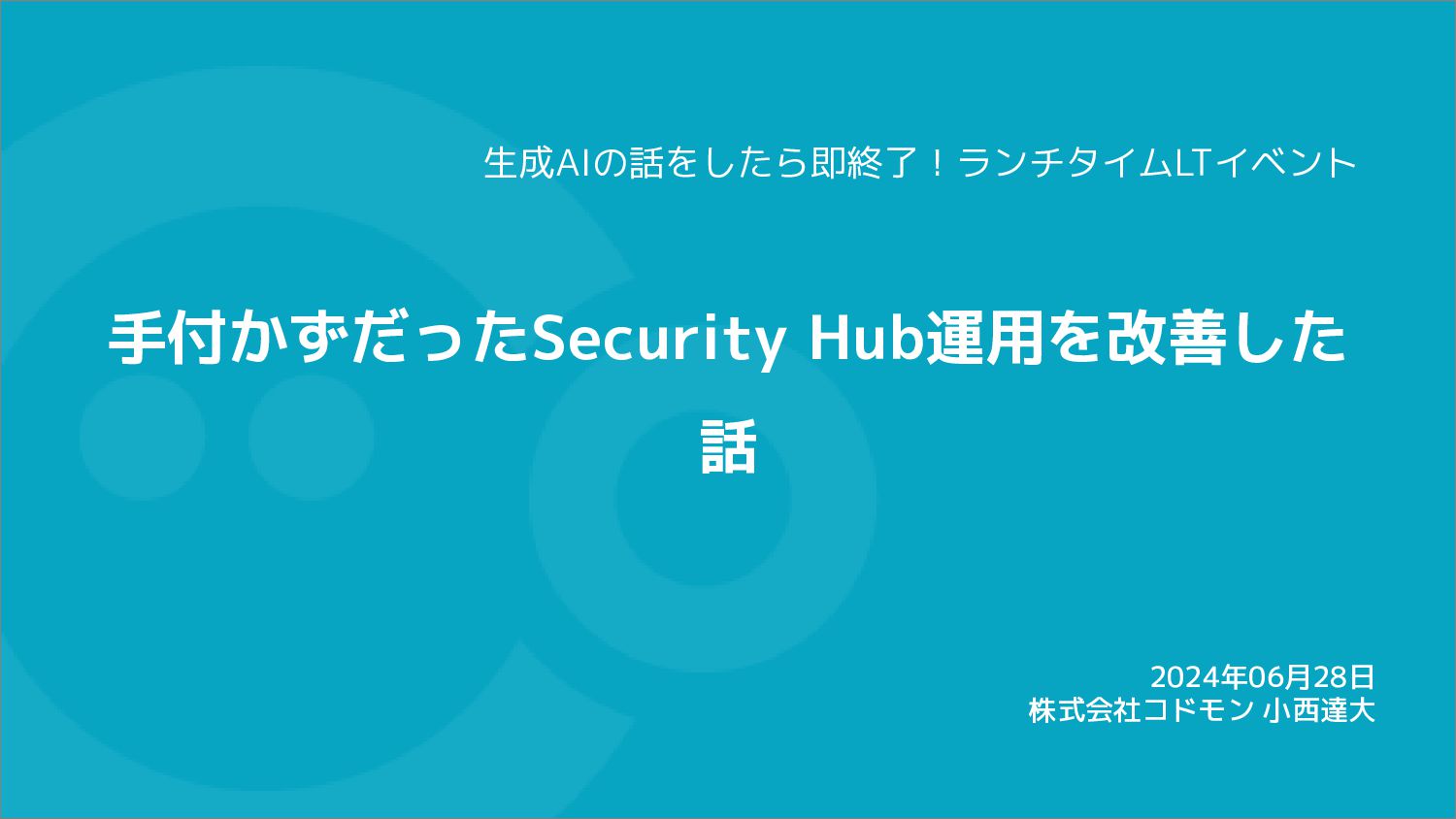 手付かずだったSecurity Hub運用を改善した 話 2024年06月28日 株式会社コドモン 小西達大 生成AIの話をしたら即終了!ランチタイムLTイベント