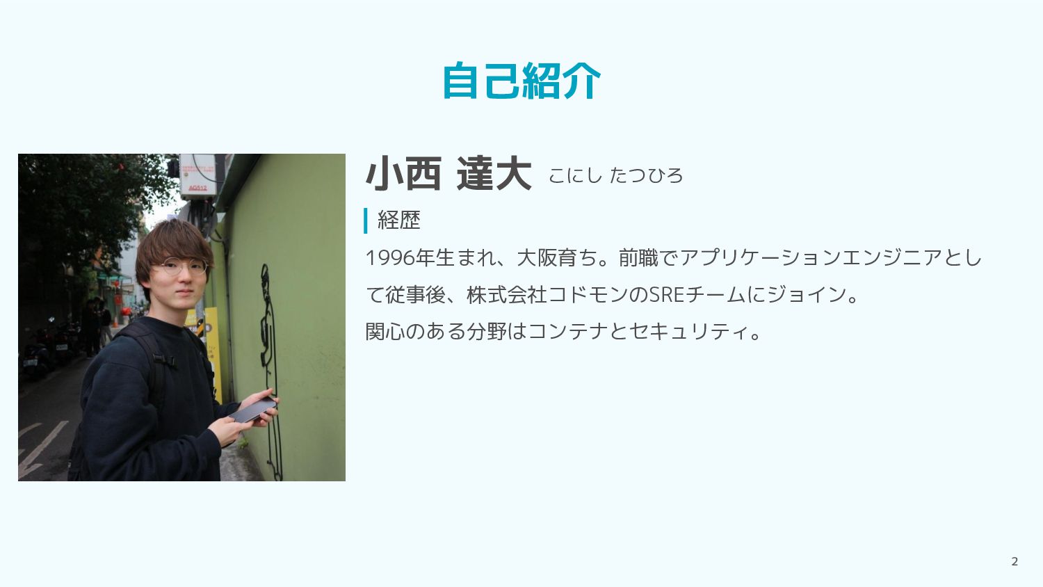 2 経歴 1996年生まれ、大阪育ち。前職でアプリケーションエンジニアとし て従事後、株式会社コドモンのSREチームにジョイン。 関心のある分野はコンテナとセキュリティ。 自己紹介 小西 達大 こにし たつひろ