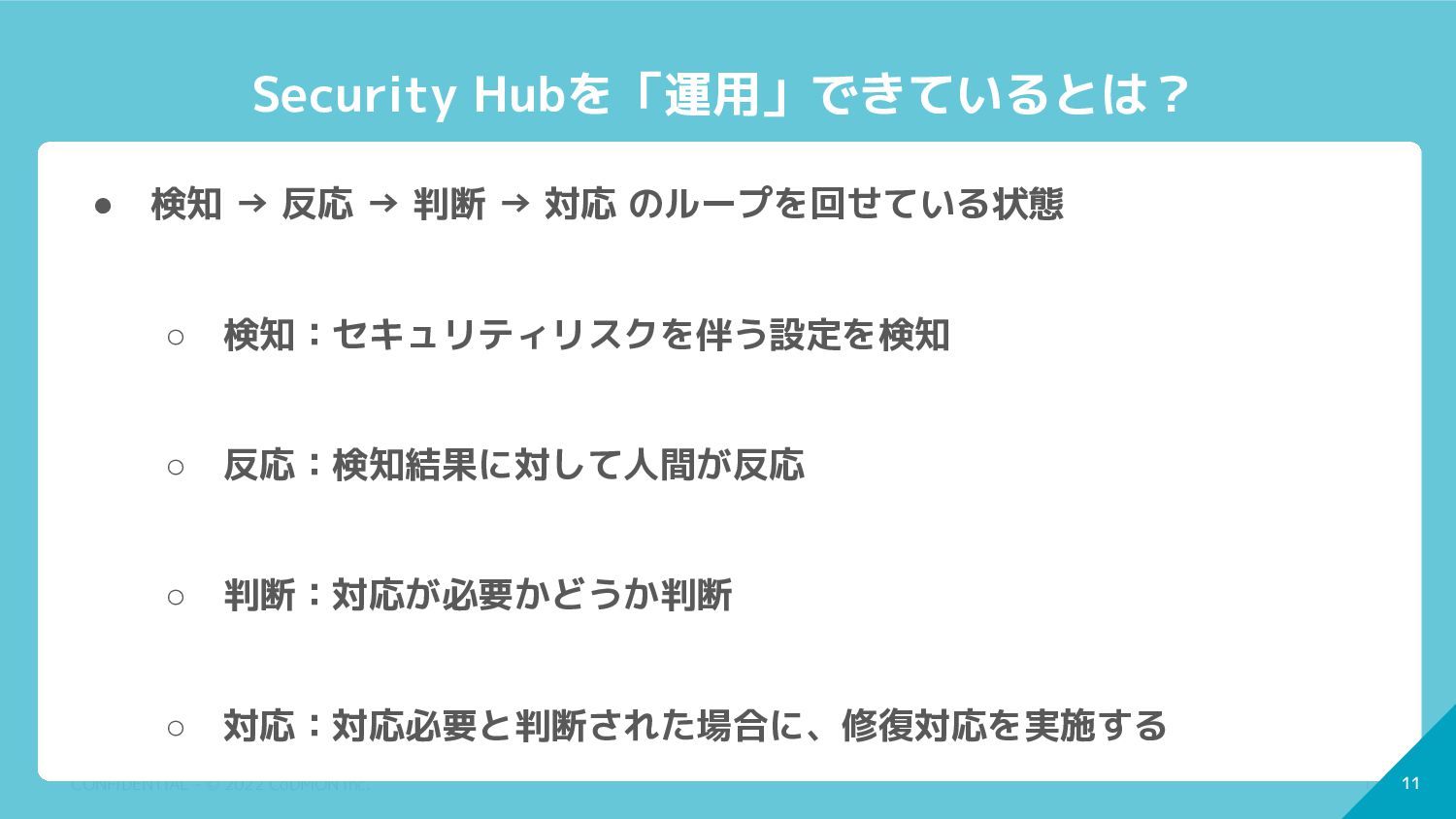 11 CONFIDENTIAL - © 2022 CoDMON Inc. 11 Security Hubを「運用」できているとは?