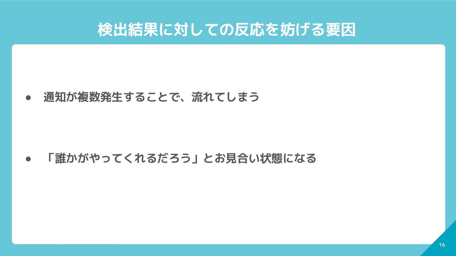 16 CONFIDENTIAL - © 2022 CoDMON Inc. 16 検出結果に対しての反応を妨げる要因 •
