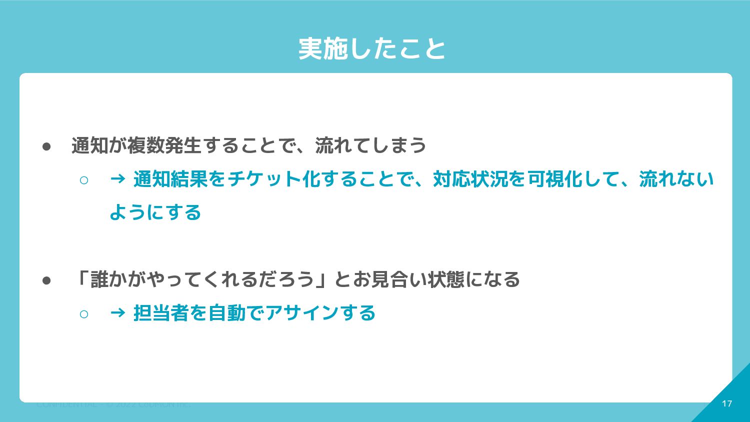 通知が複数発生することで、流れてしまう ◦ → 通知結果をチケット化することで、対応状況を可視化して、流れない ようにする • 「誰かがやってくれるだろう」とお見合い状態になる ◦ → 担当者を自動でアサインする