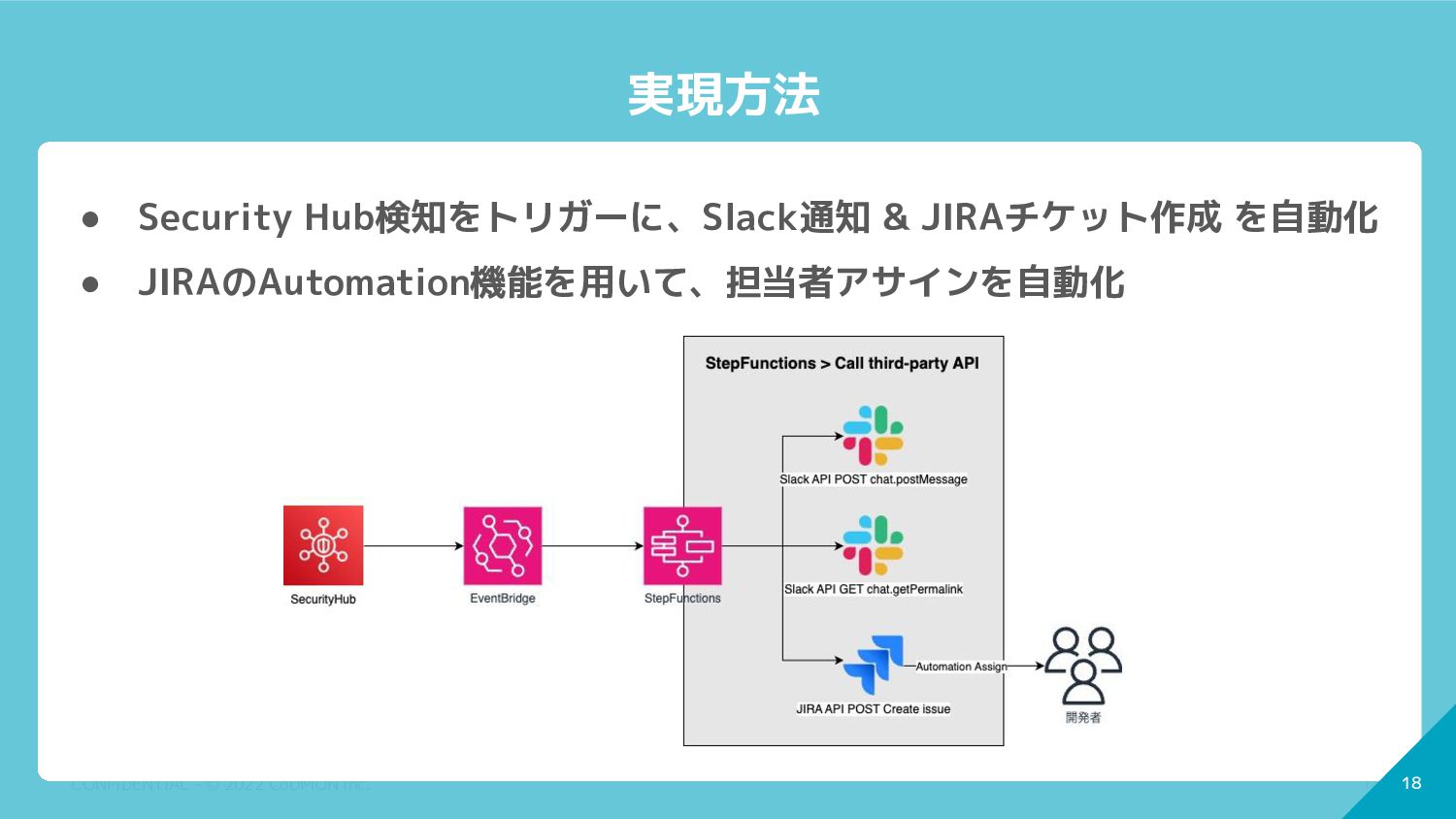Security Hub検知をトリガーに、Slack通知 & JIRAチケット作成 を自動化 • JIRAのAutomation機能を用いて、担当者アサインを自動化