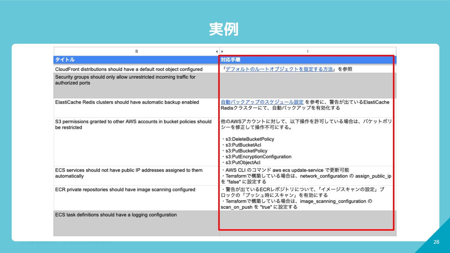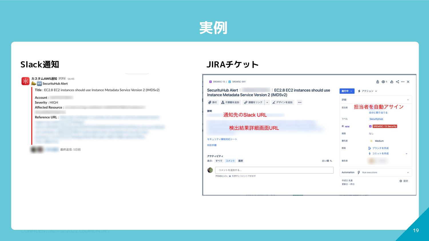 検知結果のチケット化 ◦ 各開発チームの開発フローや、利用しているタスク管理ツールに合わせ て、チケット自動作成機構を構築 • 対応手順の充足 ◦ AWSに詳しくない場合でも、迷わず対応できるようにする