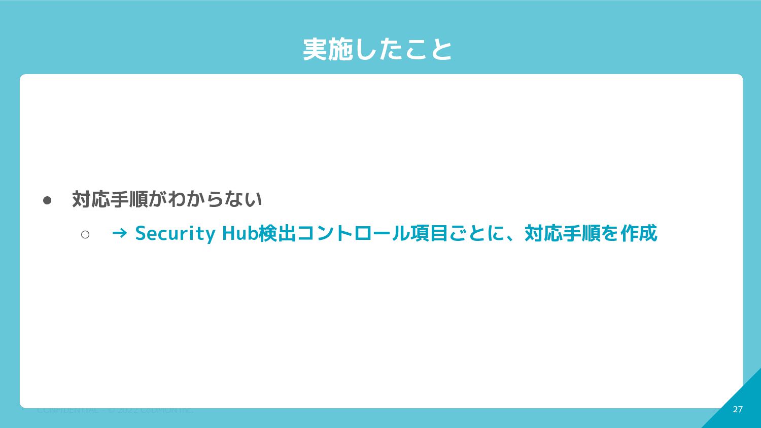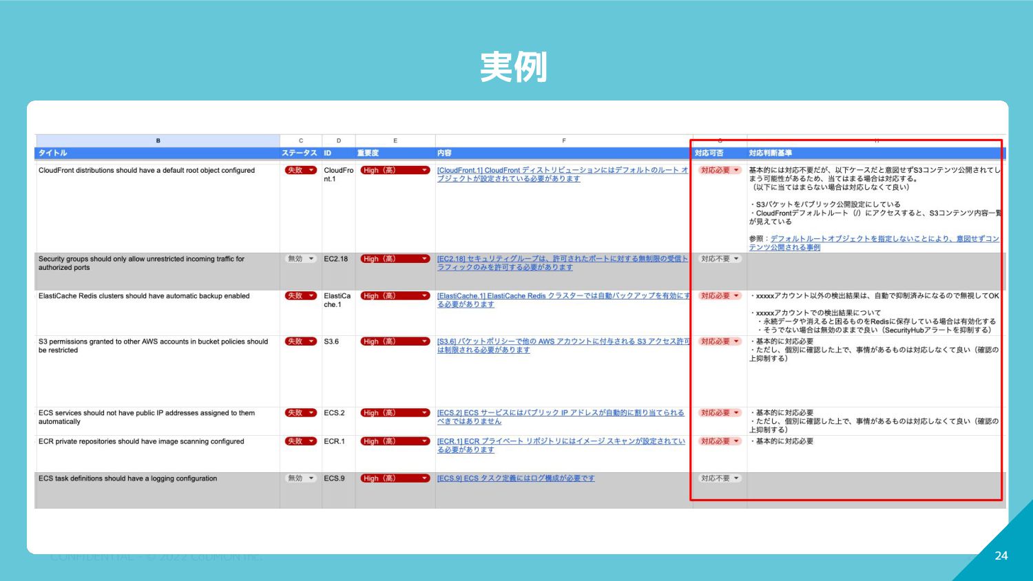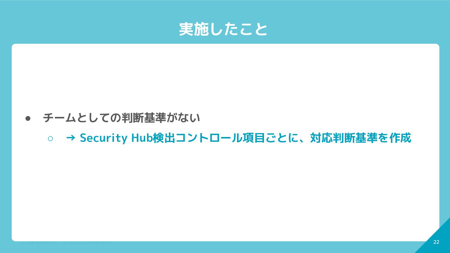 チームとしての判断基準がない ◦ → Security Hub検出コントロール項目ごとに、対応判断基準を作成