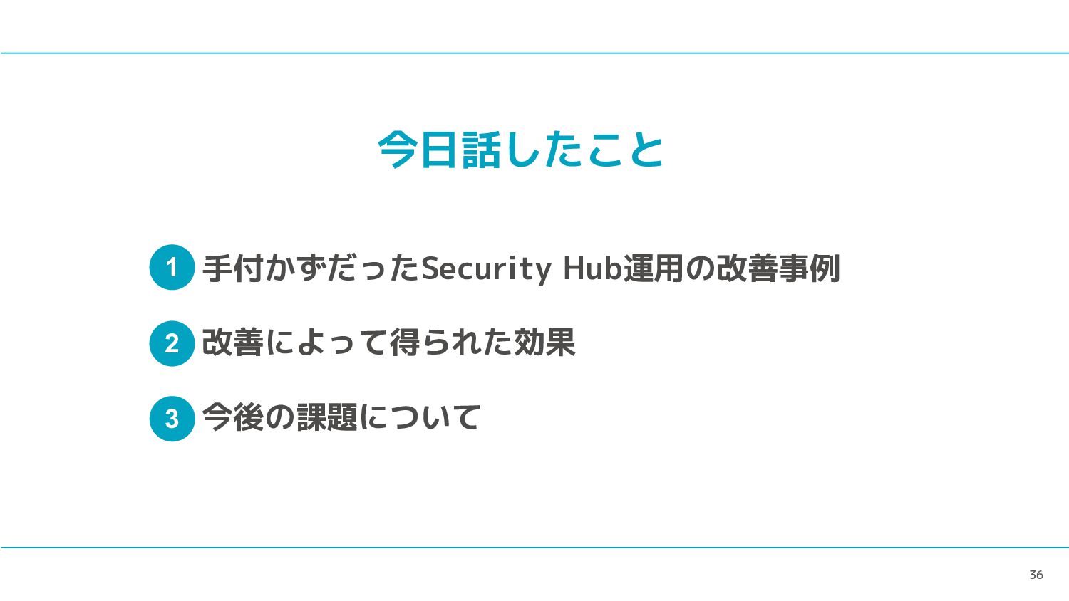 36 今日話したこと 手付かずだったSecurity Hub運用の改善事例 改善によって得られた効果 今後の課題について 1 2 3