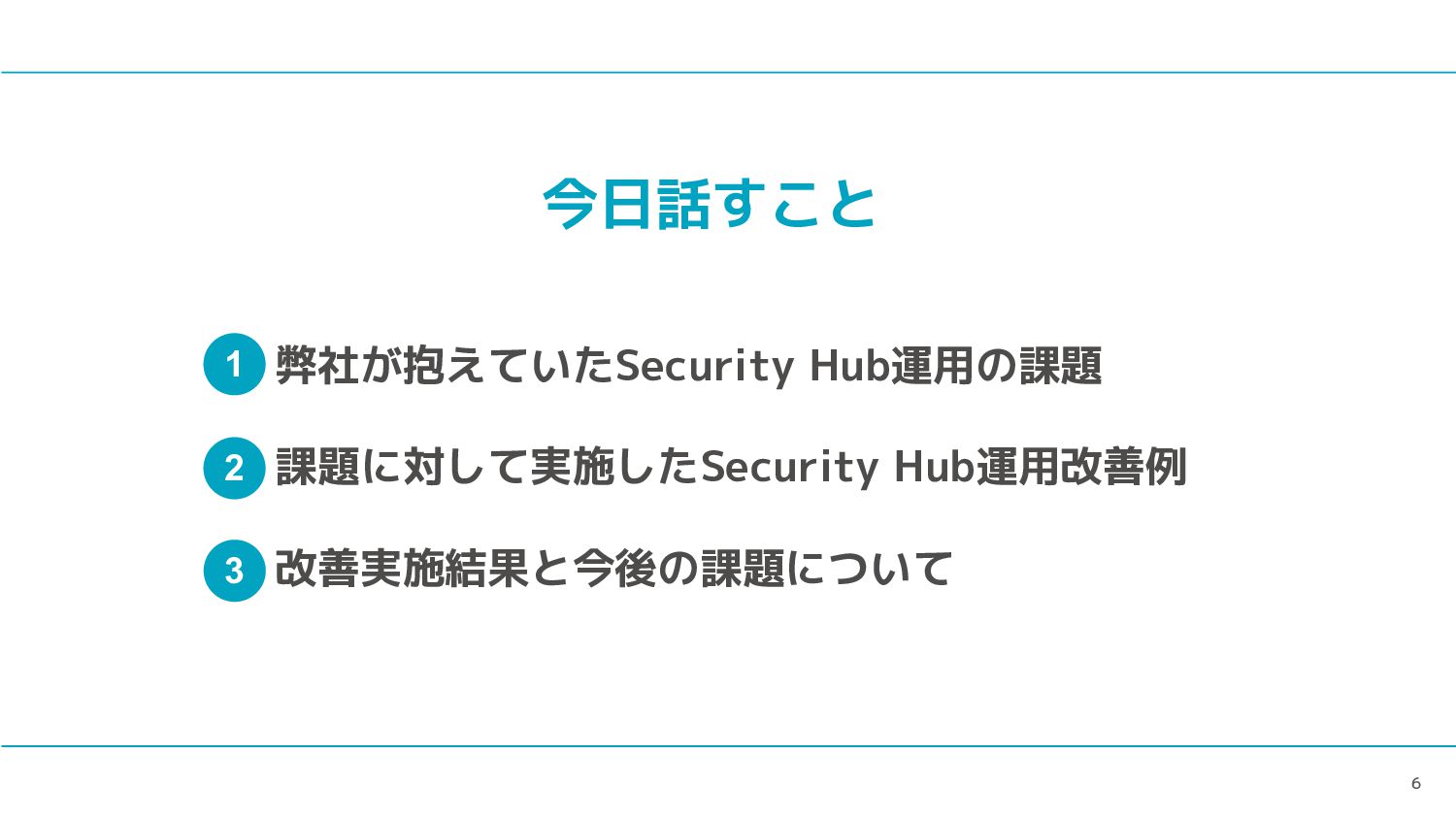 6 今日話すこと 弊社が抱えていたSecurity Hub運用の課題 課題に対して実施したSecurity Hub運用改善例 改善実施結果と今後の課題について 1 2 3