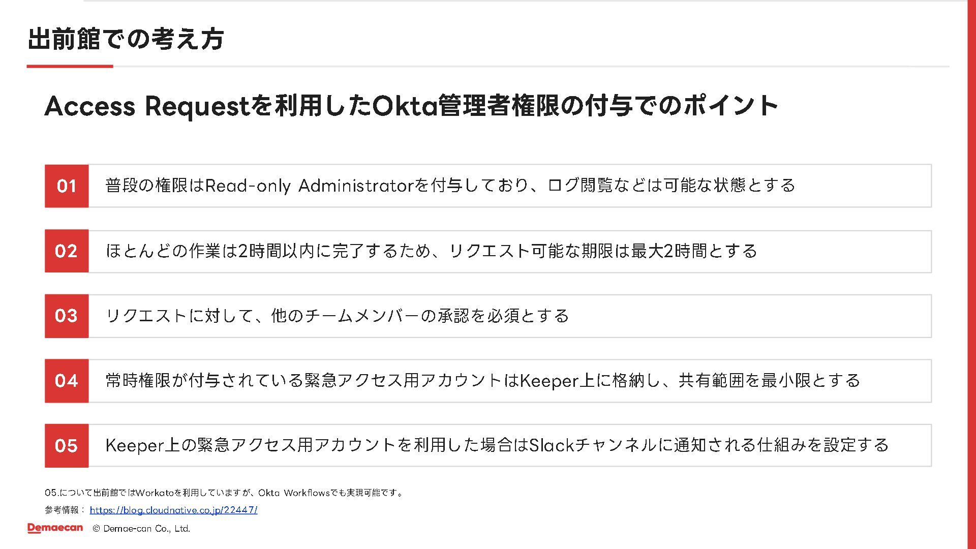 でででででででででででででで 05. ででででででででで Workato でででででででででで Okta Workflows ででででででででで ででででで https:// blog.cloudnative.co.jp /22447/ でででででで Read - only Administrator ででででででででででででででででででででででで でででででででで 2 ででででででででででででででででででででででででで 2 ででででで でででででででででででででででででででででででででででで ででででででででででででででででででででででででで Keeper ででででででででででででででででで Keeper でででででででででででででででででででででで Slack ででででででででででででででででででで 01 02 03 04 05 でででででででで