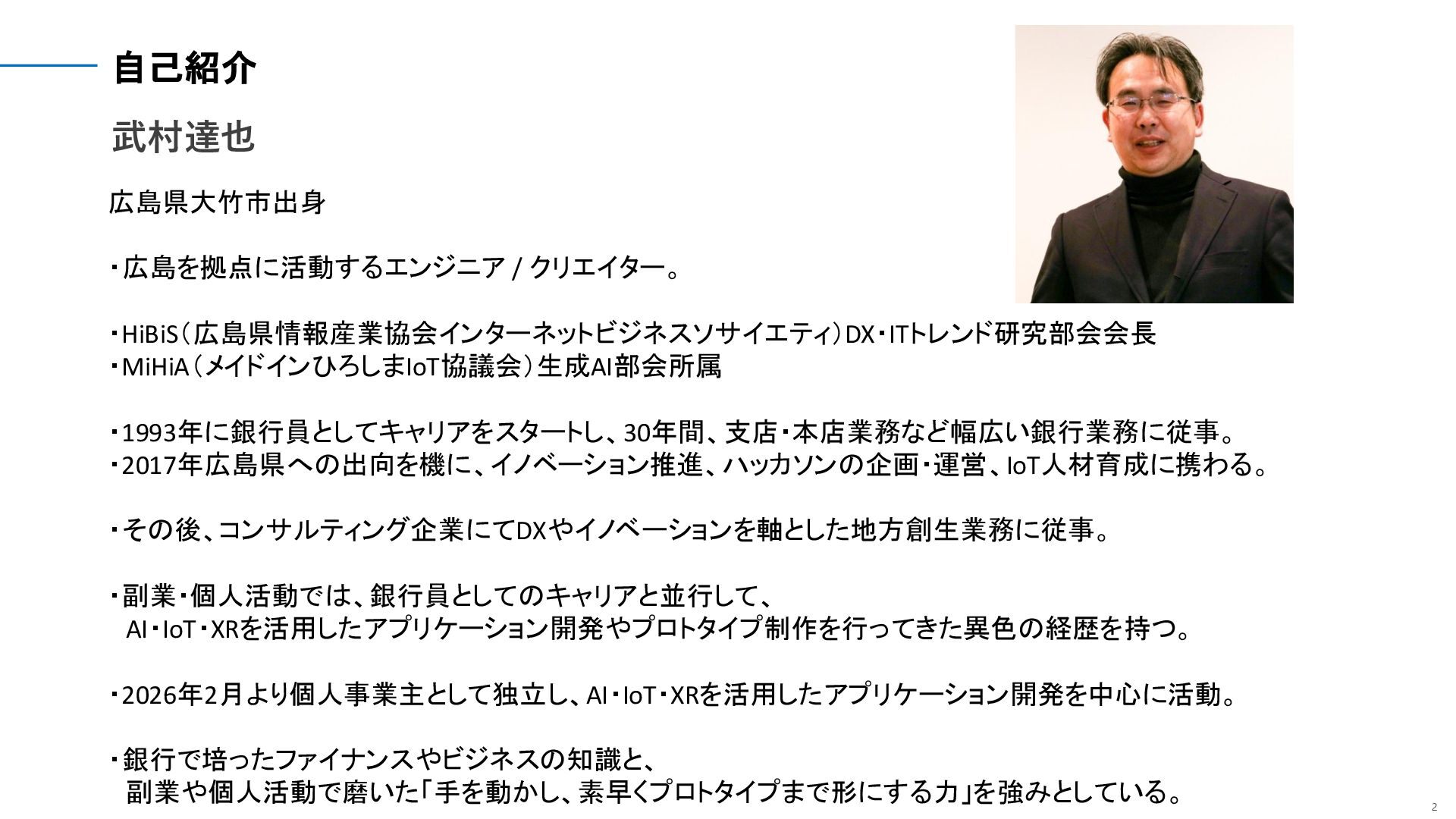 2 自己紹介 武村達也 広島県大竹市出身 ・広島を拠点に活動するエンジニア / クリエイター。 ・HiBiS(広島県情報産業協会インターネットビジネスソサイエティ)DX・ITトレンド研究部会会長 ・MiHiA(メイドインひろしまIoT協議会)生成AI部会所属 ・1993年に銀行員としてキャリアをスタートし、30年間、支店・本店業務など幅広い銀行業務に従事。