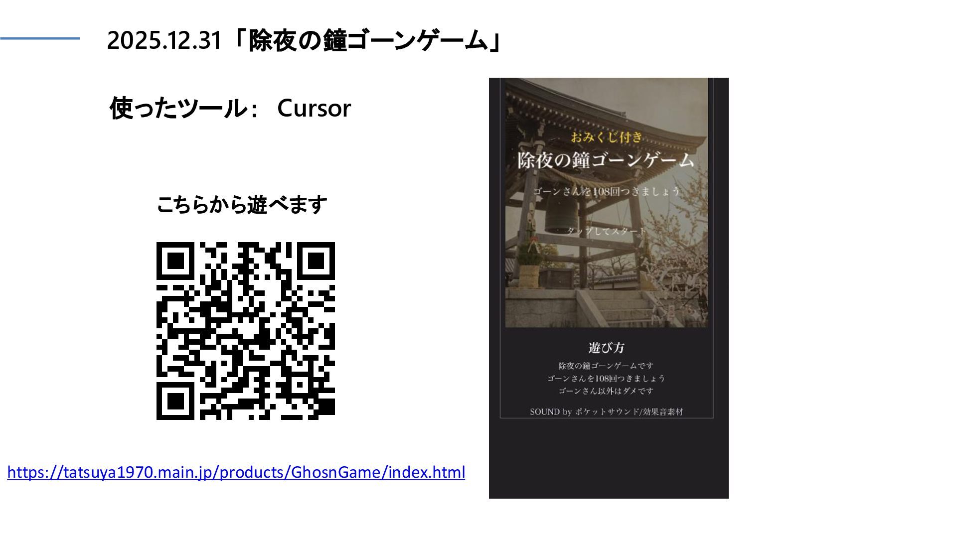 2025.12.31 「除夜の鐘ゴーンゲーム」 使ったツール: Cursor こちらから遊べます https://tatsuya1970.main.jp/products/GhosnGame/index.html