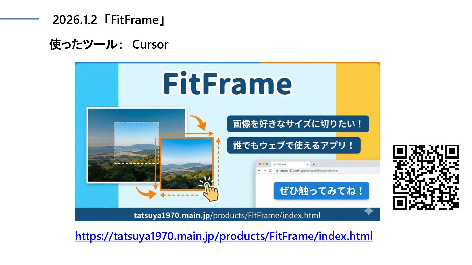 2026.1.2 「FitFrame」 使ったツール: Cursor https://tatsuya1970.main.jp/products/FitFrame/index.html