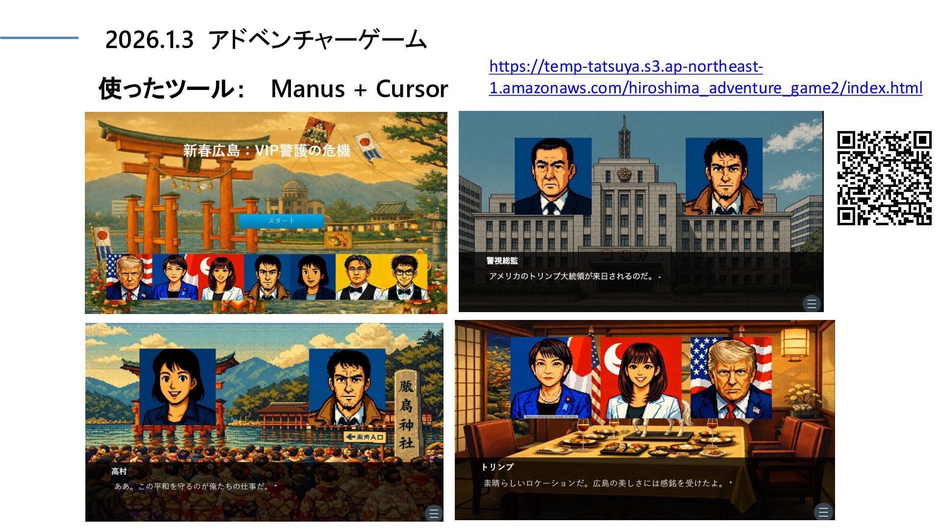 2026.1.3 アドベンチャーゲーム 使ったツール: Manus + Cursor https://temp-tatsuya.s3.ap-northeast- 1.amazonaws.com/hiroshima_adventure_game2/index.html