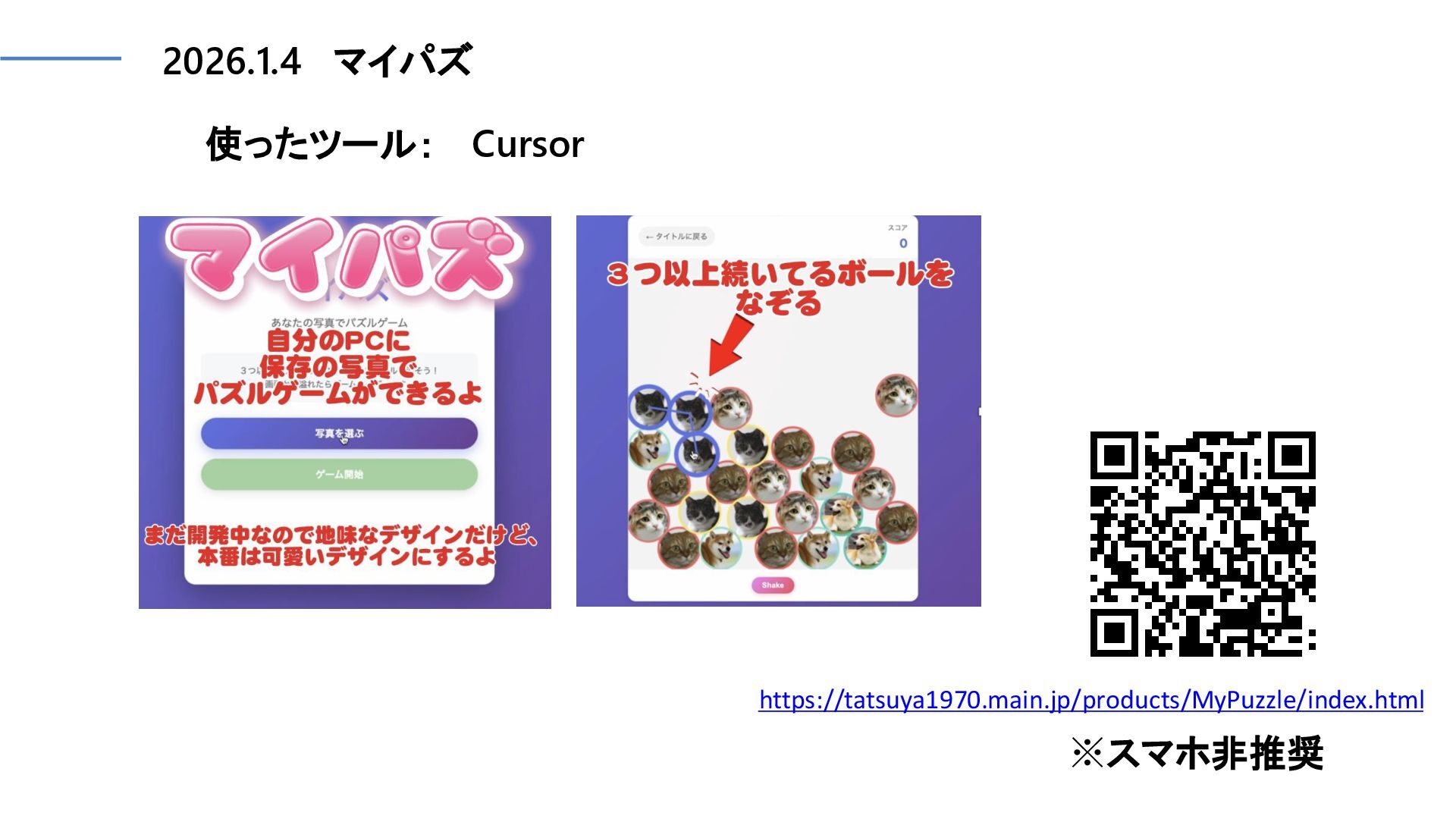 2026.1.4 マイパズ 使ったツール: Cursor https://tatsuya1970.main.jp/products/MyPuzzle/index.html ※スマホ非推奨