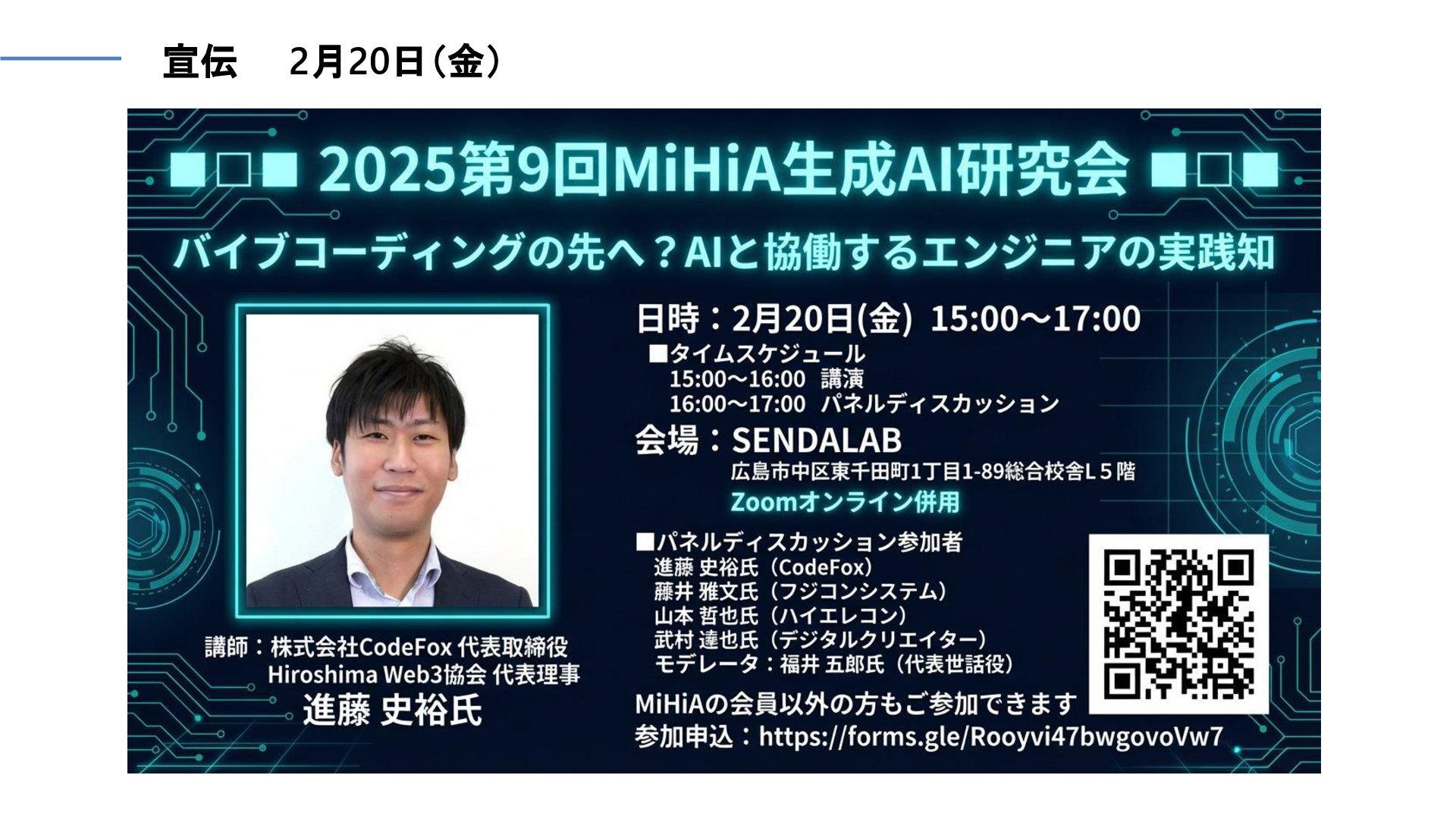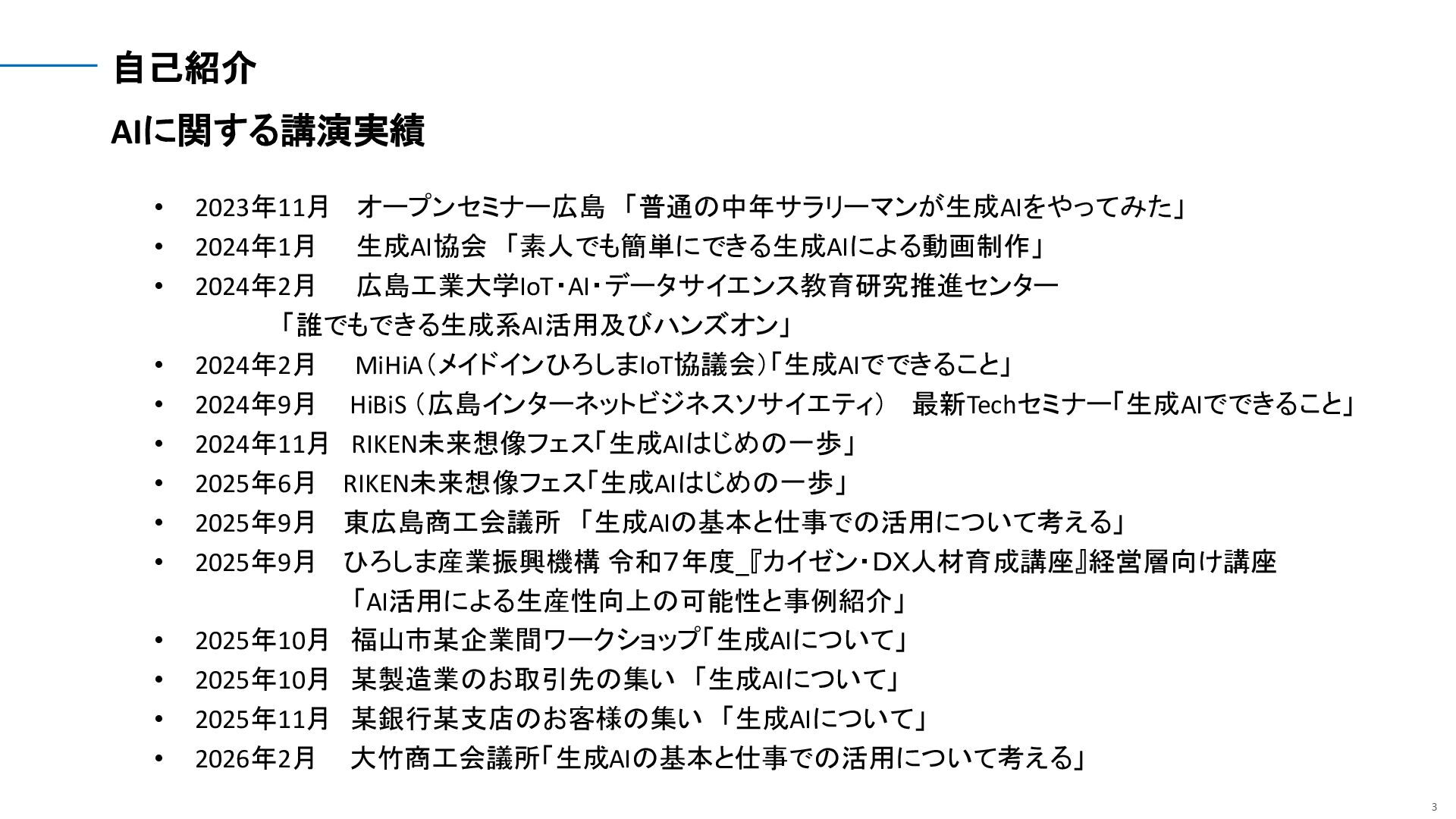 「素人でも簡単にできる生成AIによる動画制作」 • 2024年2月 広島工業大学IoT・AI・データサイエンス教育研究推進センター 「誰でもできる生成系AI活用及びハンズオン」 • 2024年2月 MiHiA(メイドインひろしまIoT協議会)「生成AIでできること」 • 2024年9月 HiBiS (広島インターネットビジネスソサイエティ) 最新Techセミナー「生成AIでできること」 • 2024年11月 RIKEN未来想像フェス「生成AIはじめの一歩」 • 2025年6月 RIKEN未来想像フェス「生成AIはじめの一歩」 • 2025年9月 東広島商工会議所 「生成AIの基本と仕事での活用について考える」 • 2025年9月 ひろしま産業振興機構 令和7年度_『カイゼン・DX人材育成講座』経営層向け講座 「AI活用による生産性向上の可能性と事例紹介」 • 2025年10月 福山市某企業間ワークショップ「生成AIについて」 • 2025年10月 某製造業のお取引先の集い 「生成AIについて」 • 2025年11月 某銀行某支店のお客様の集い 「生成AIについて」 • 2026年2月 大竹商工会議所「生成AIの基本と仕事での活用について考える」
